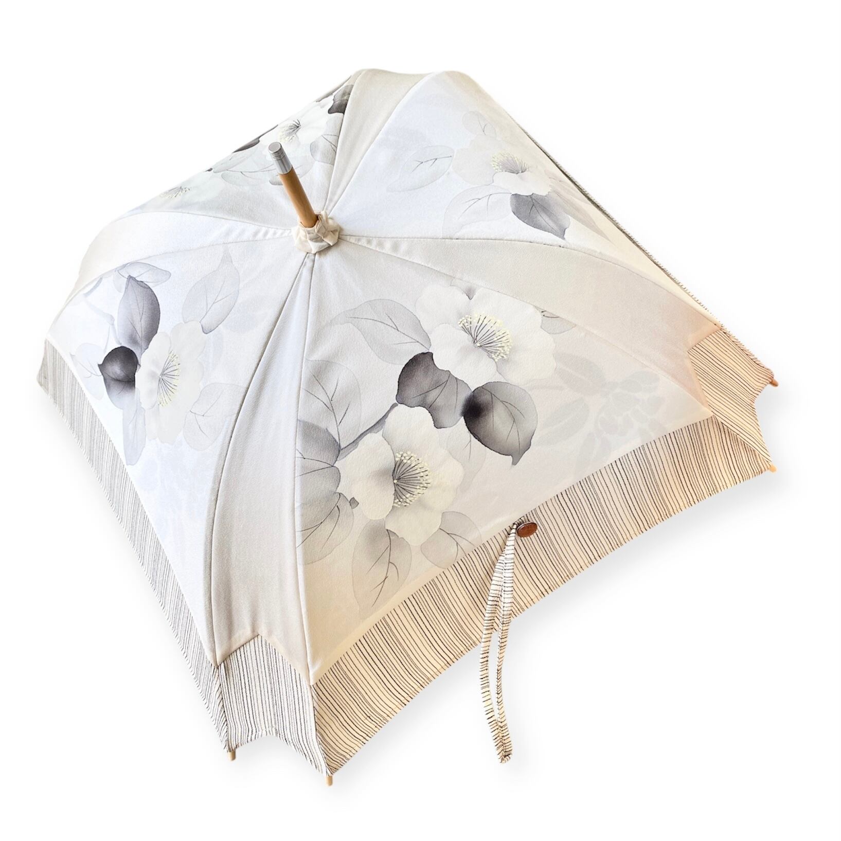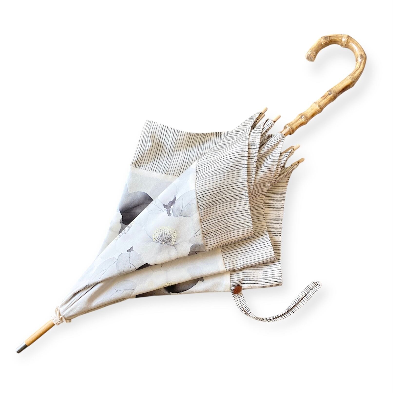 内側もかわいい着物地の日傘クロス型 長傘 モノトーン花×縞お召 内側は紫 only oneスクエア日傘