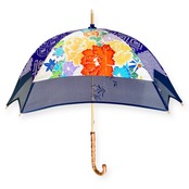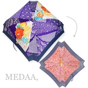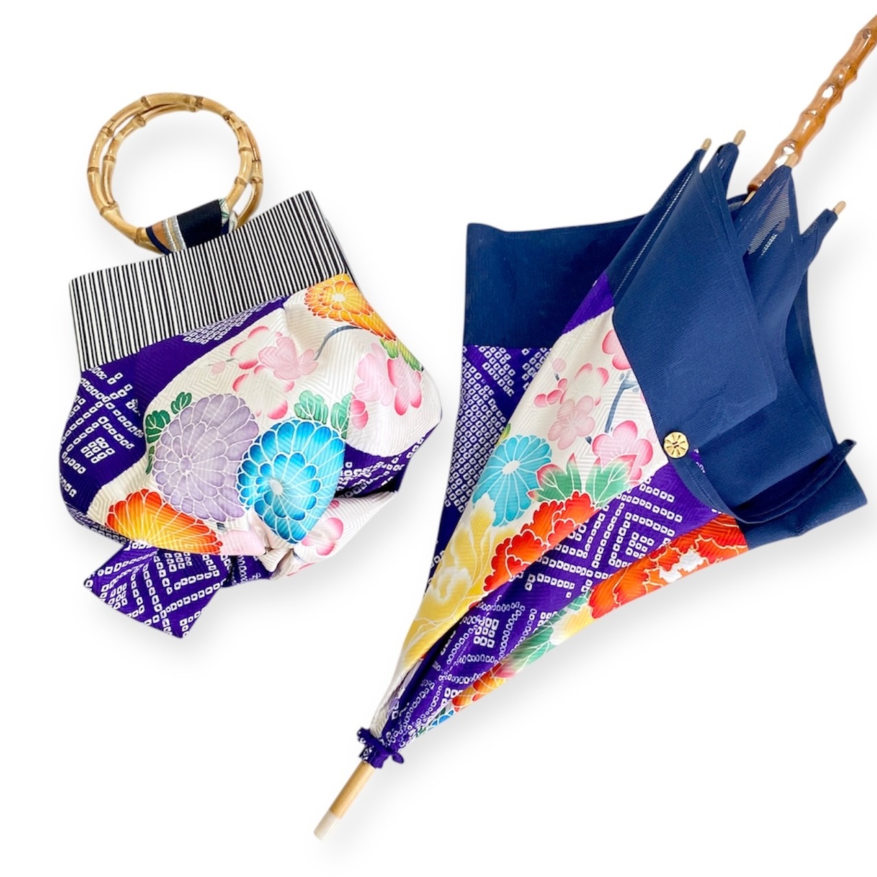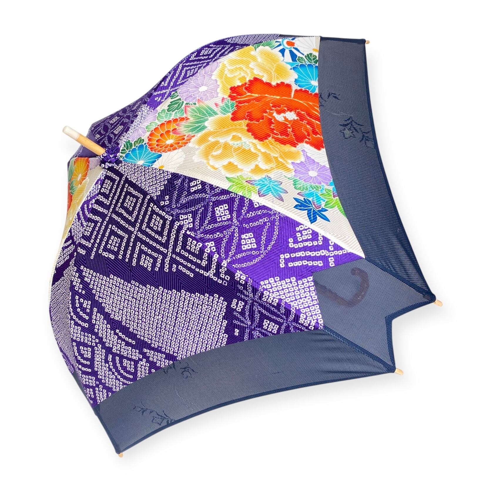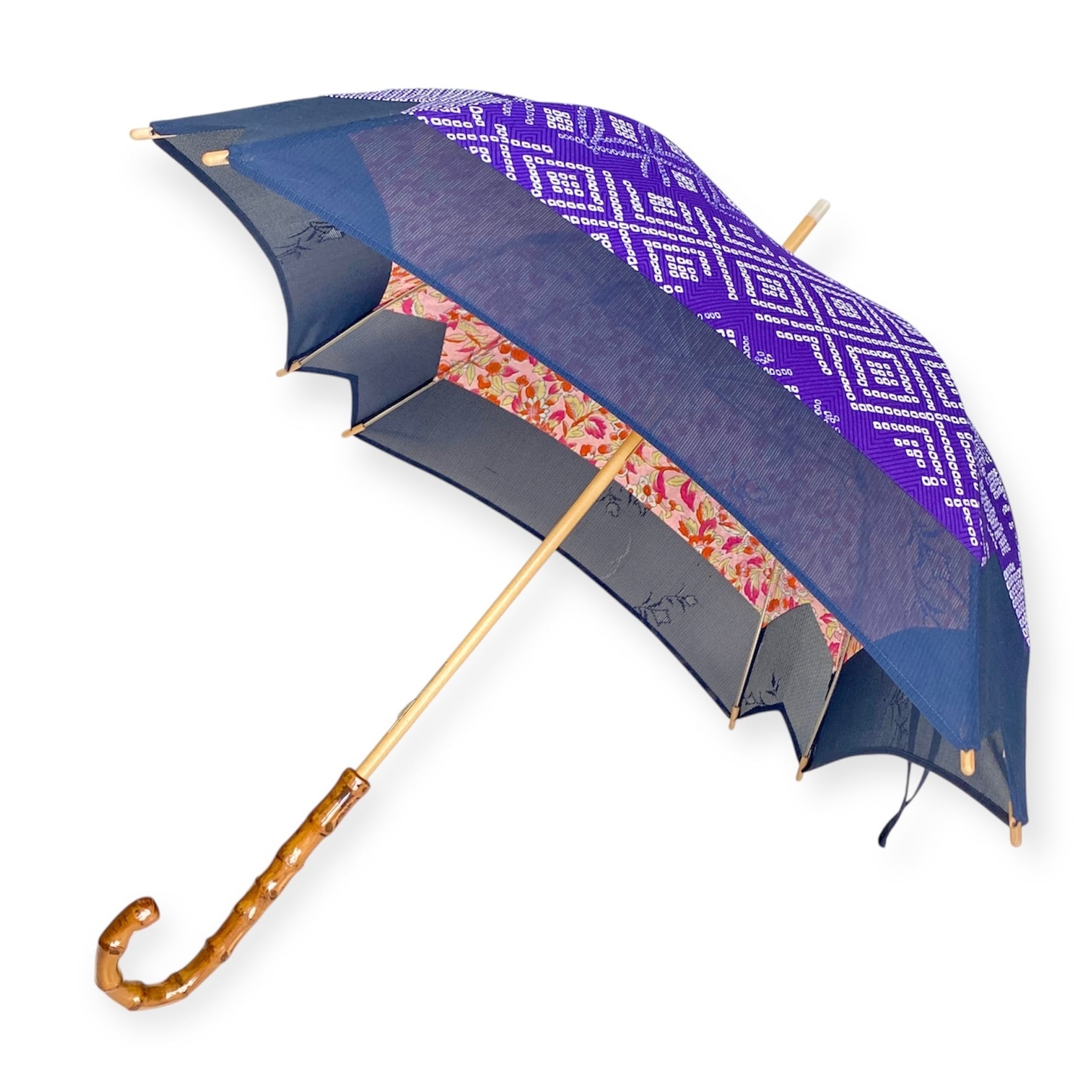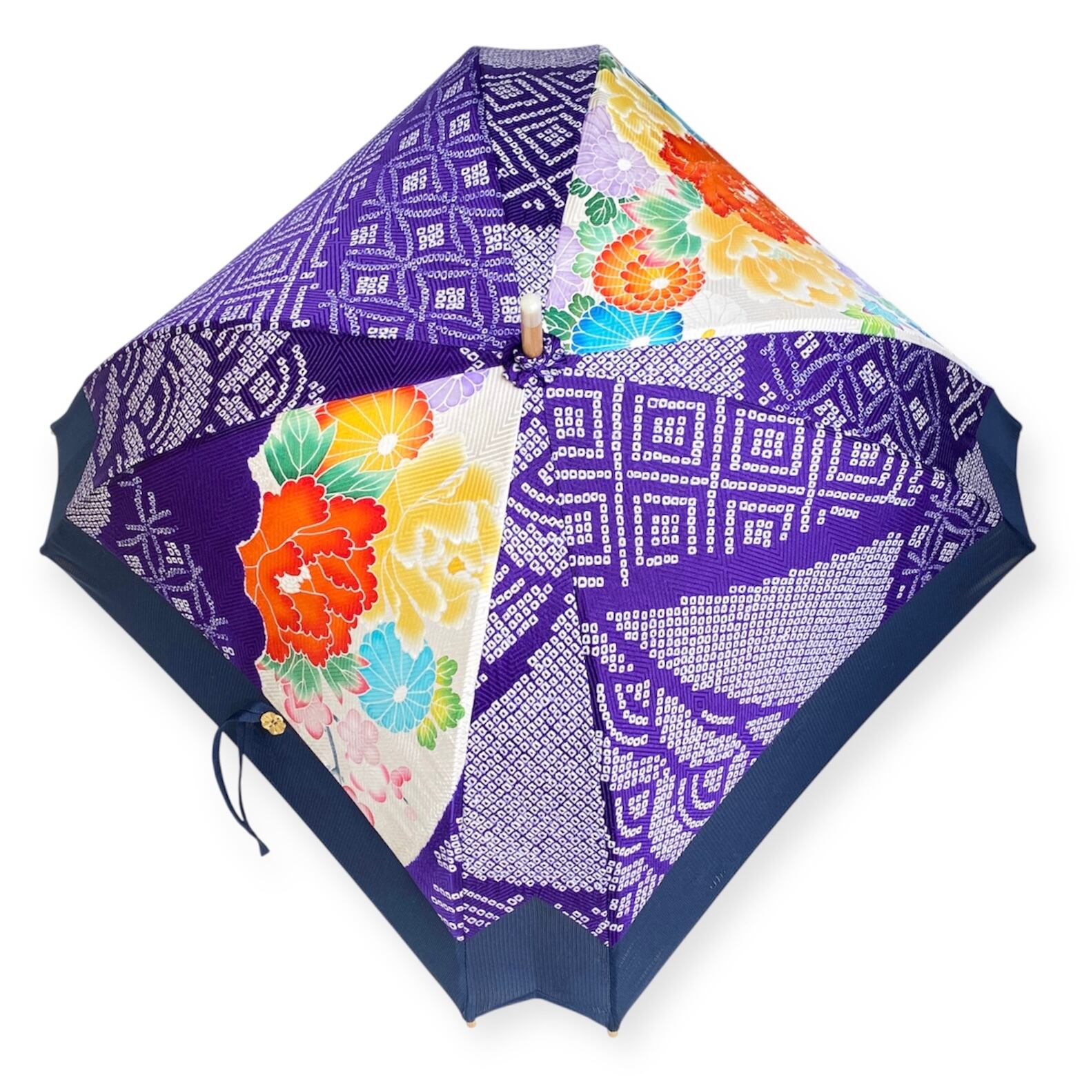 内側もかわいい着物地の日傘 クロス型 長傘 紫絞り振袖×紺絽 内側はピンク only oneスクエア日傘