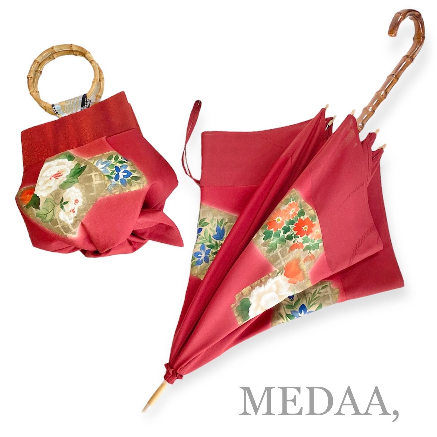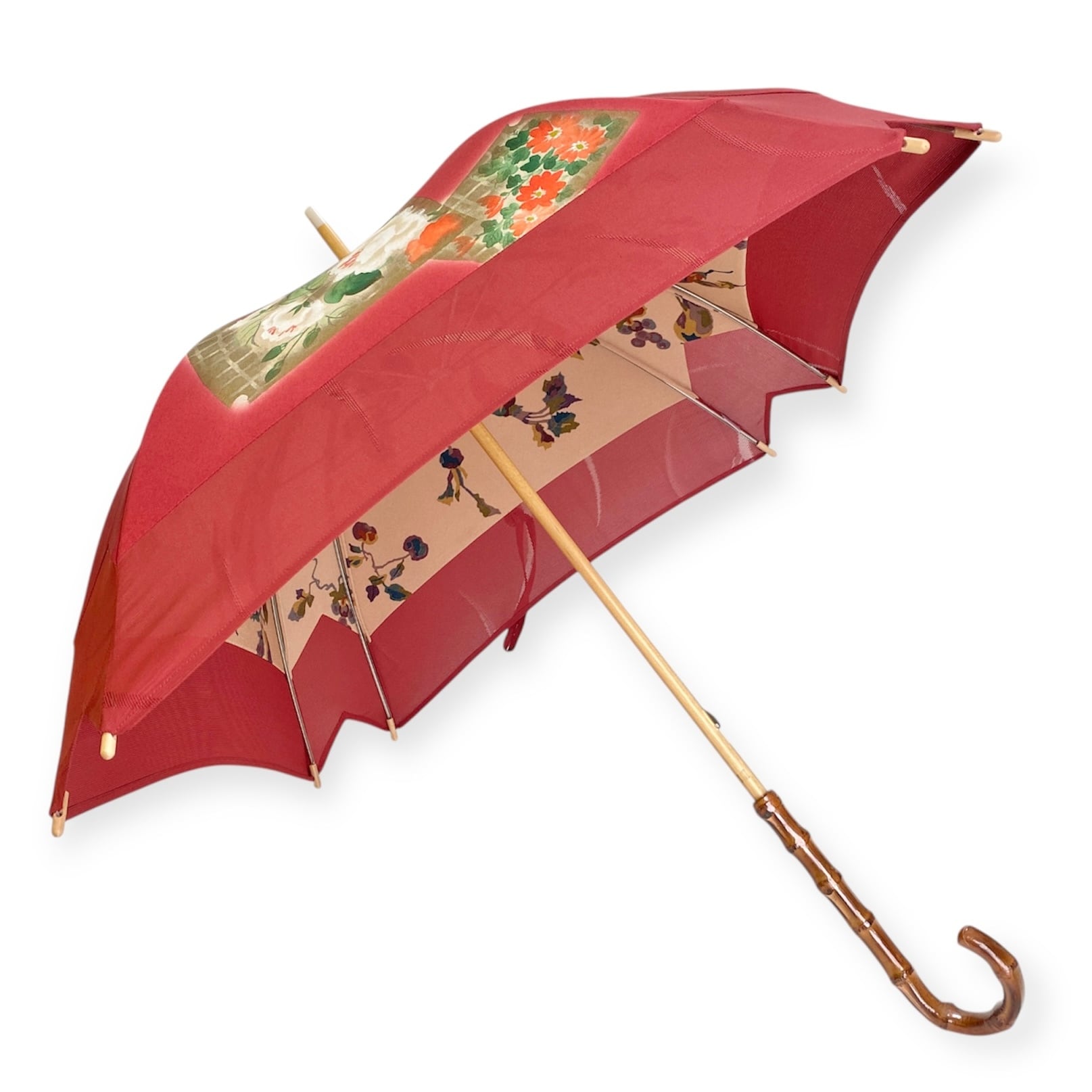 内側もかわいい着物地の日傘クロス型 長傘 赤色紙花紋×赤絽 内側はベージュ野菜 only oneスクエア日傘
