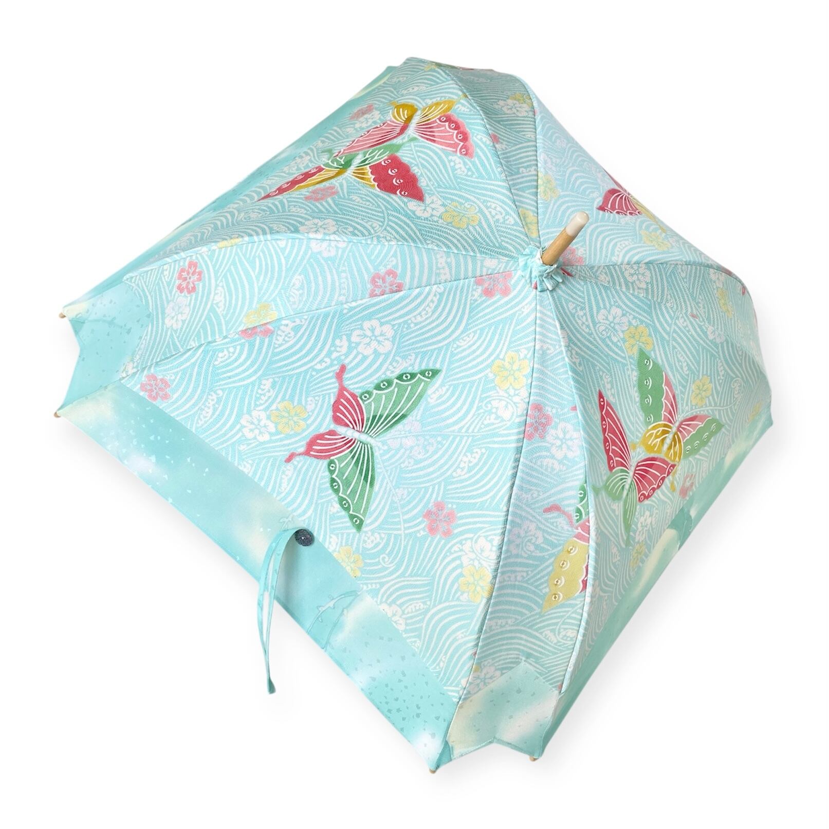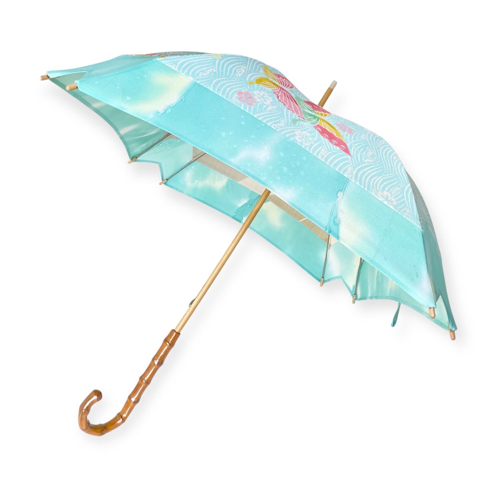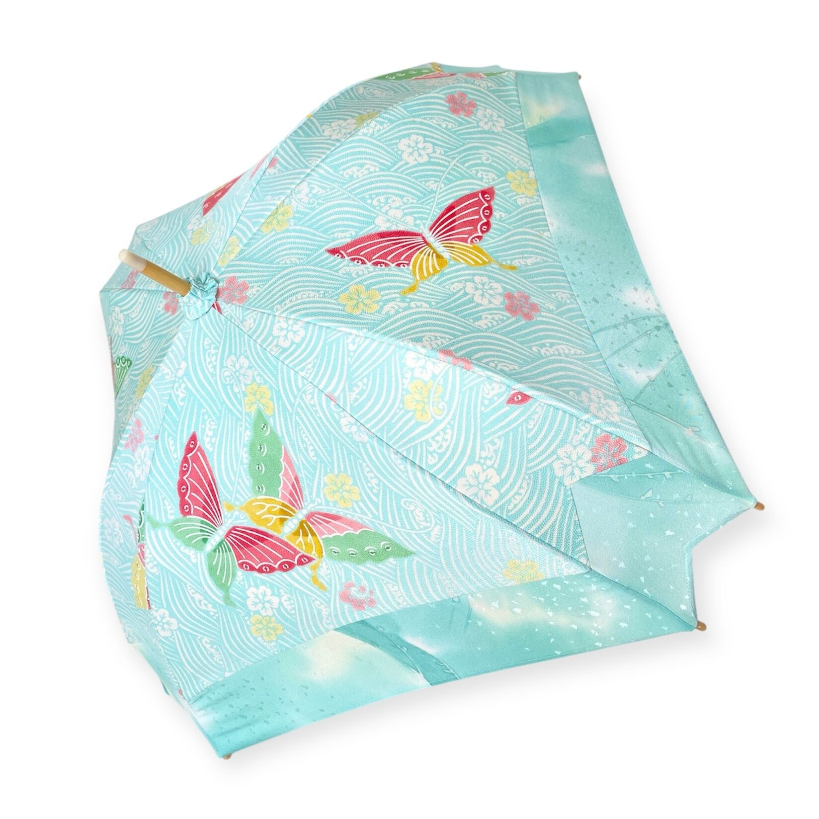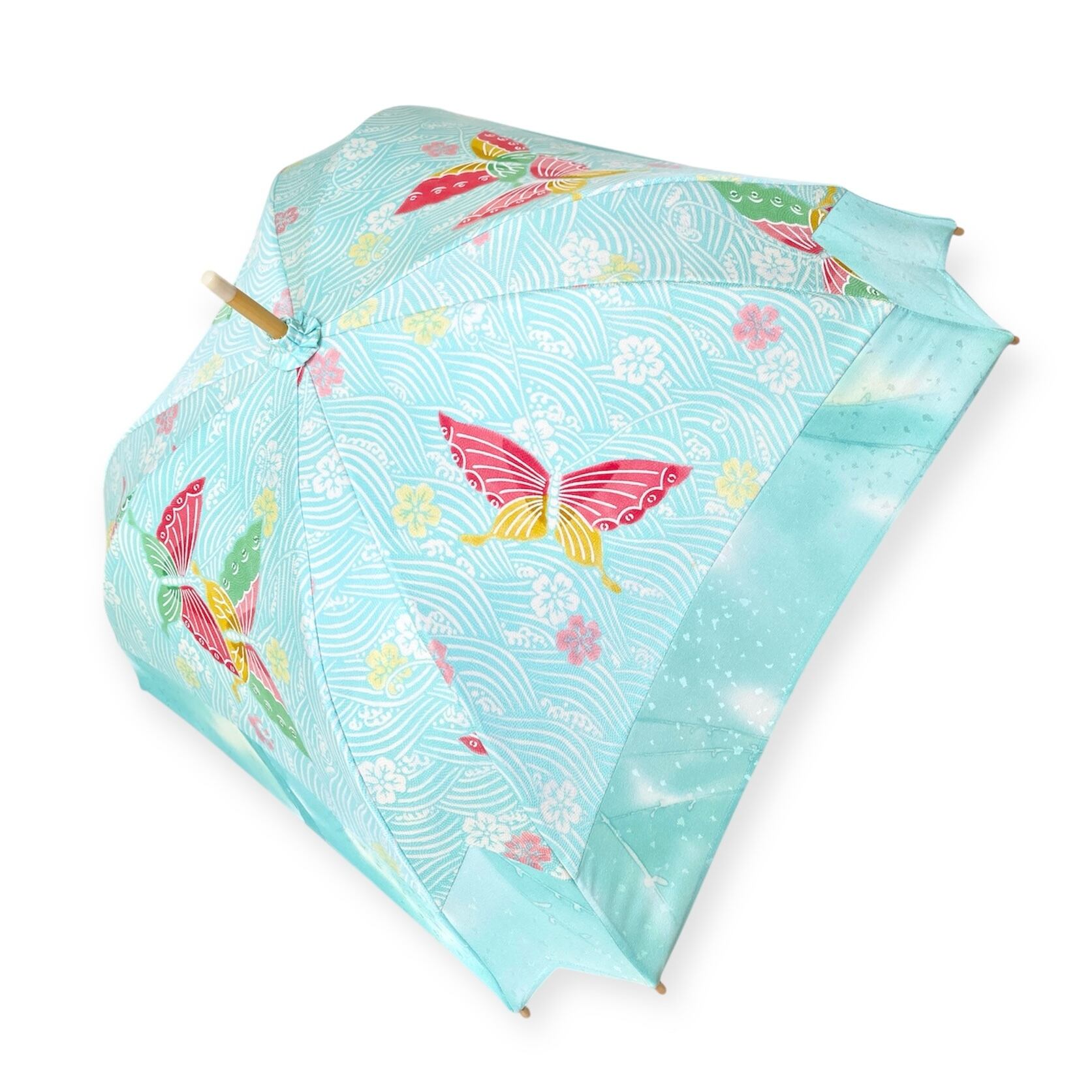 内側もかわいい着物地の日傘クロス型 長傘 水色蝶 内側はベージュ only oneスクエア日傘