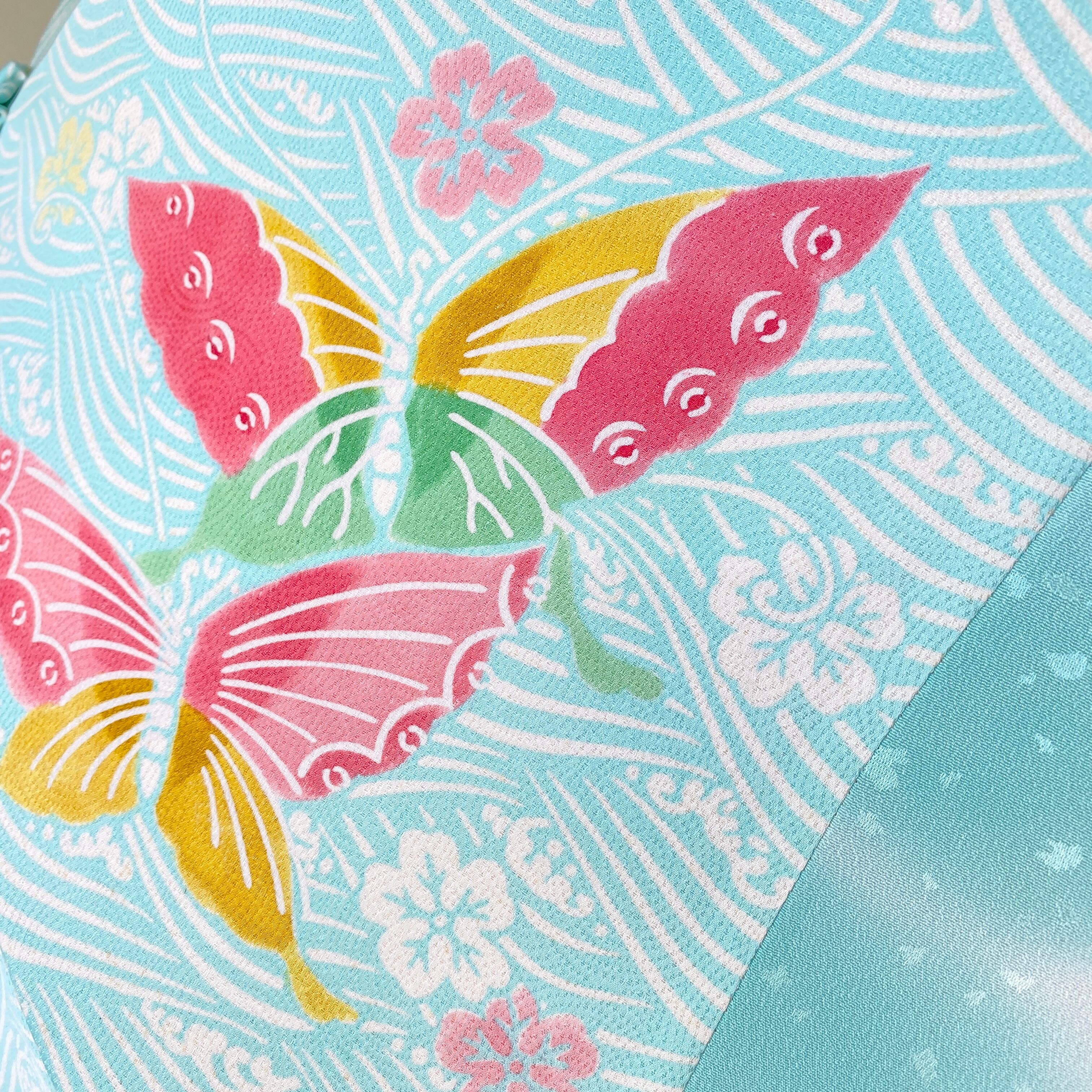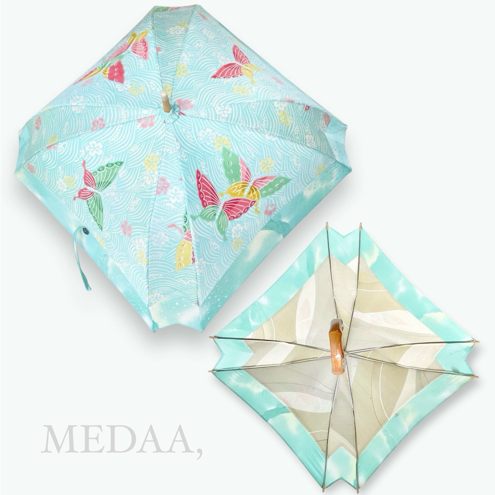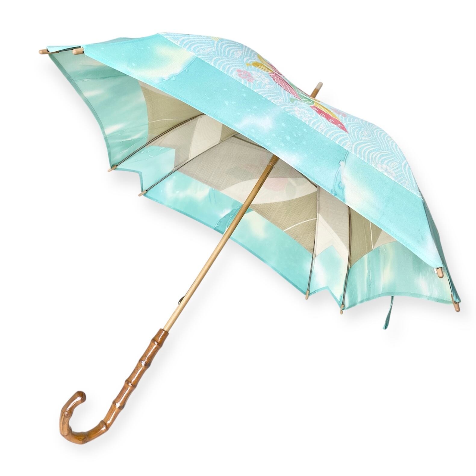 内側もかわいい着物地の日傘クロス型 長傘 水色蝶 内側はベージュ only oneスクエア日傘