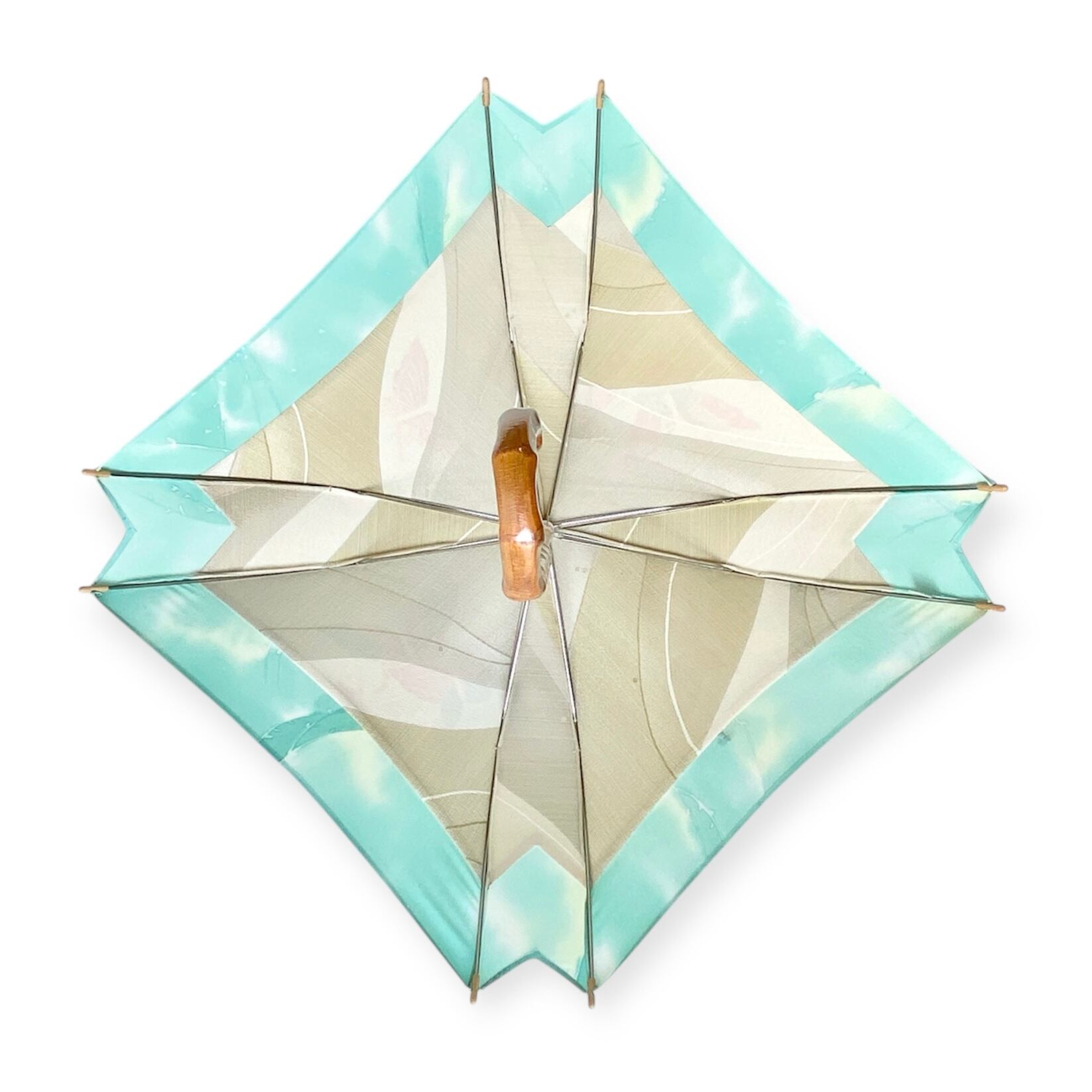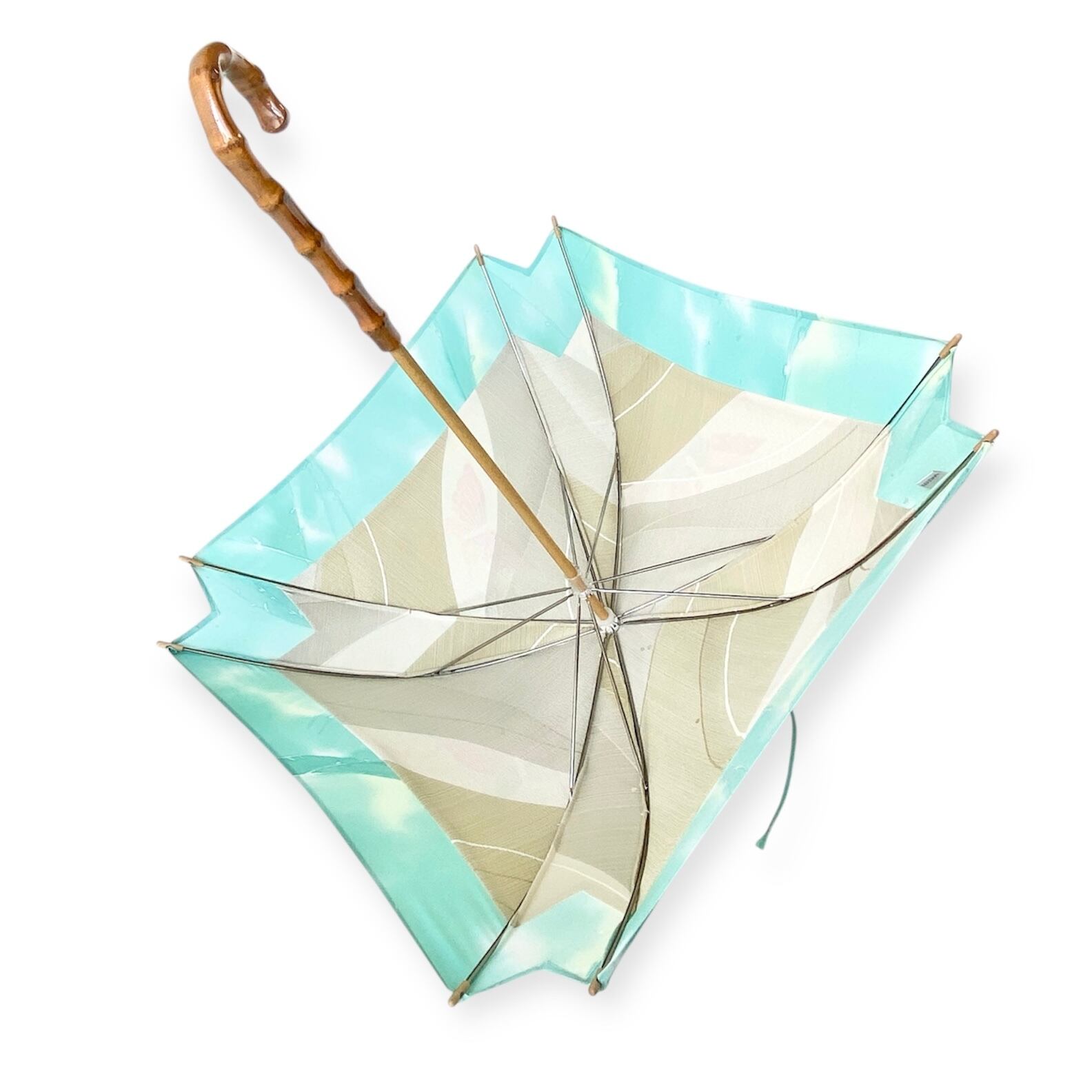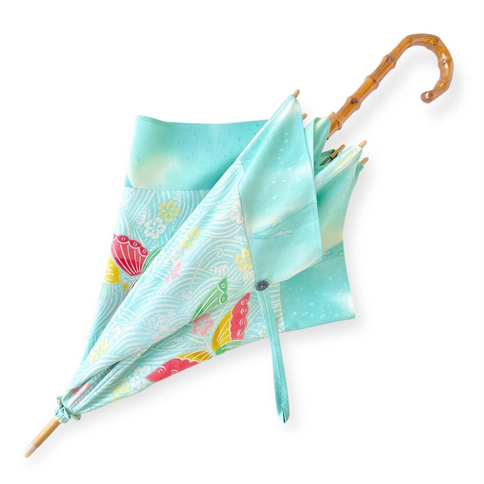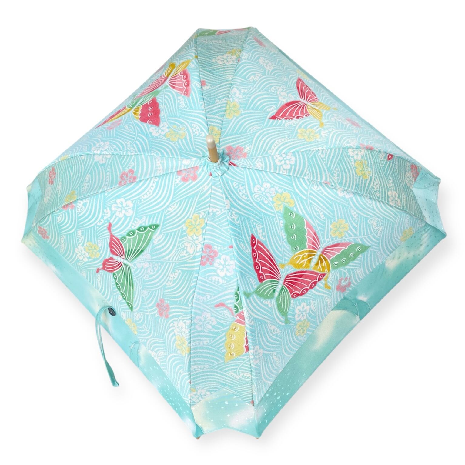 内側もかわいい着物地の日傘クロス型 長傘 水色蝶 内側はベージュ only oneスクエア日傘