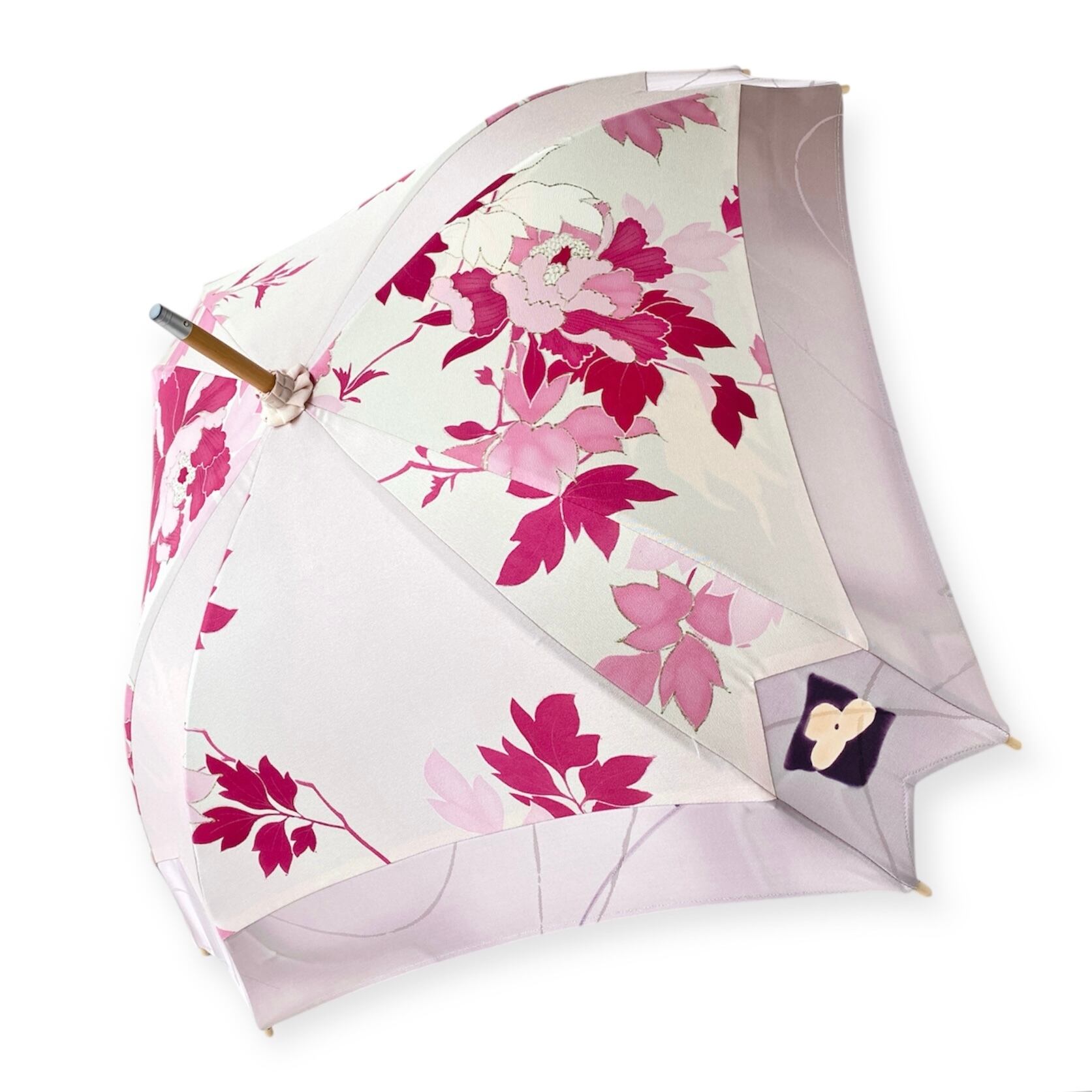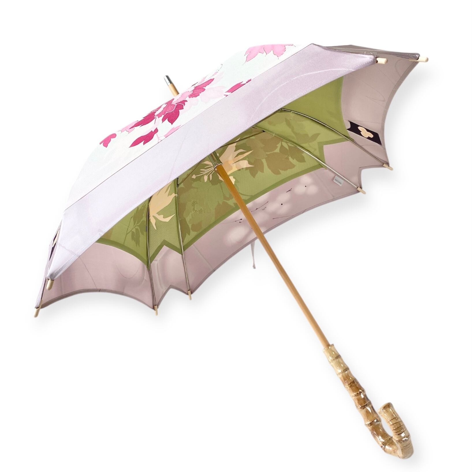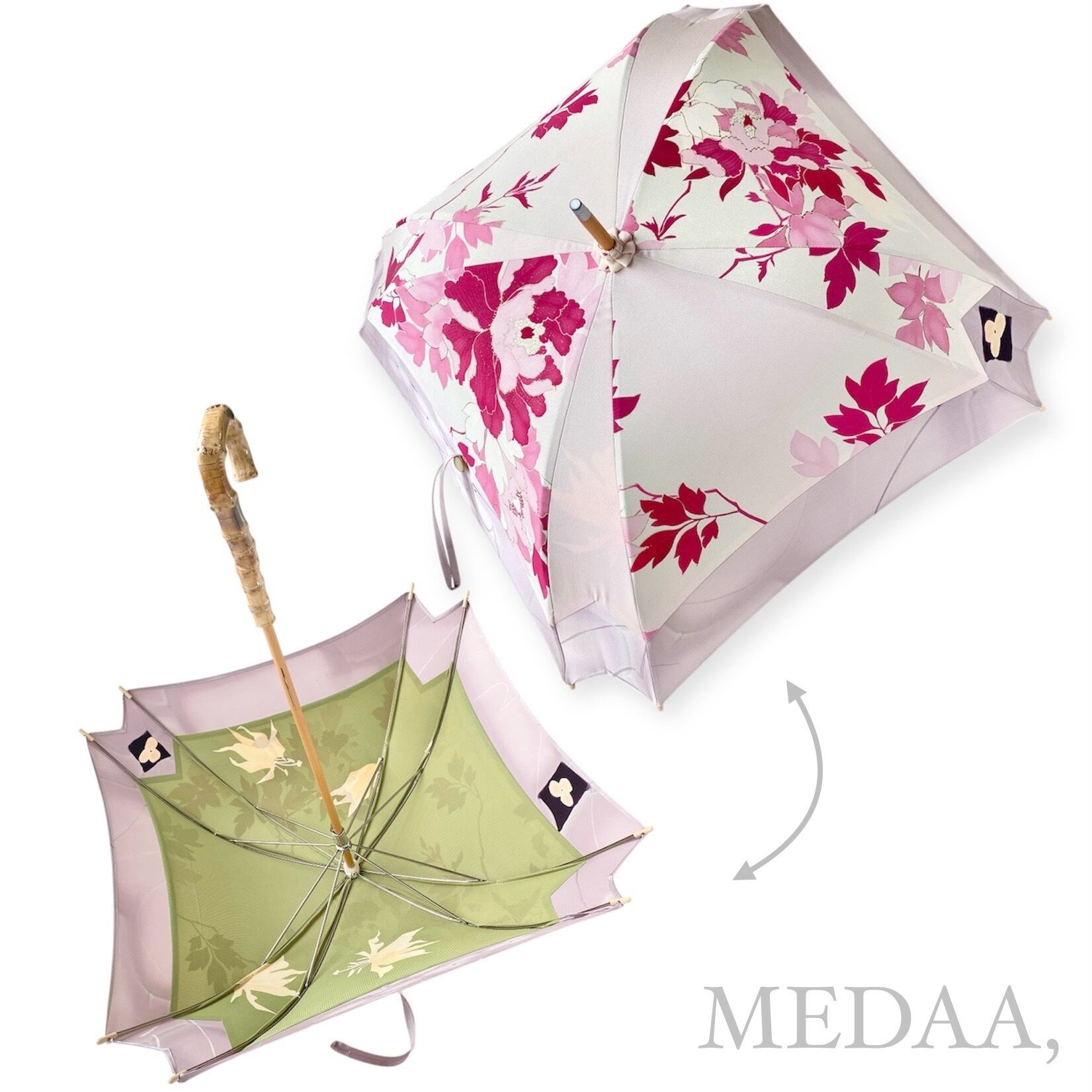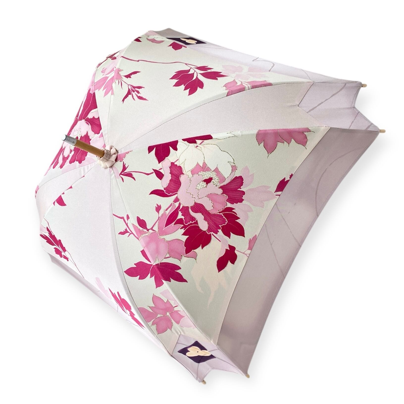 内側もかわいい着物地の日傘クロス型 四角 長傘 ピンク系金彩 内側は黄緑絽 only oneスクエア日傘