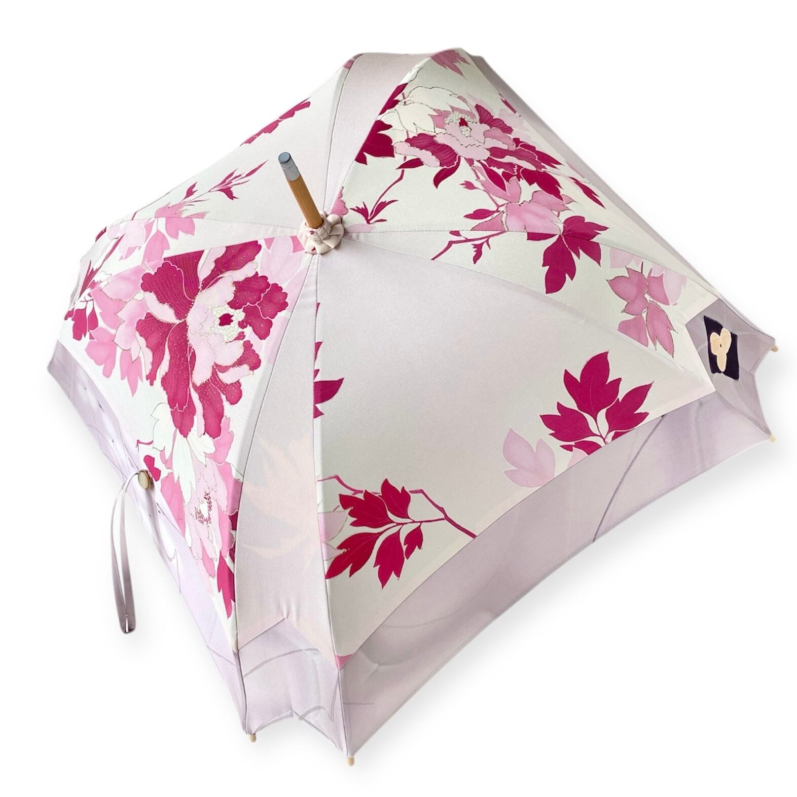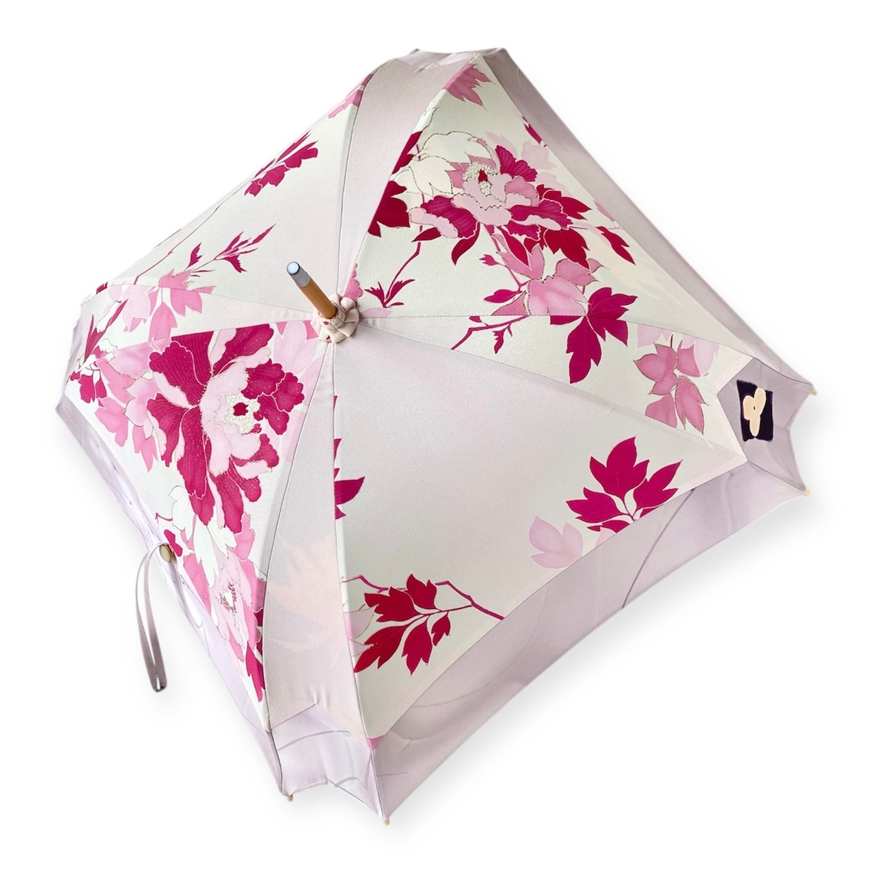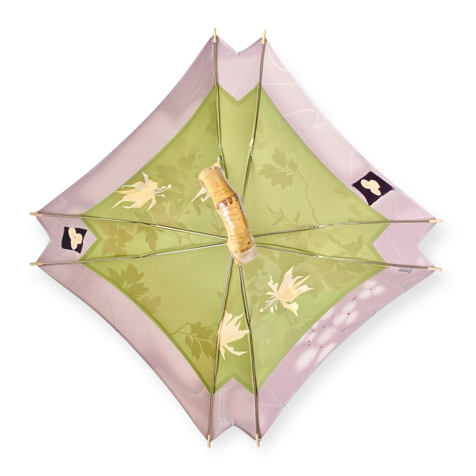 内側もかわいい着物地の日傘クロス型 四角 長傘 ピンク系金彩 内側は黄緑絽 only oneスクエア日傘