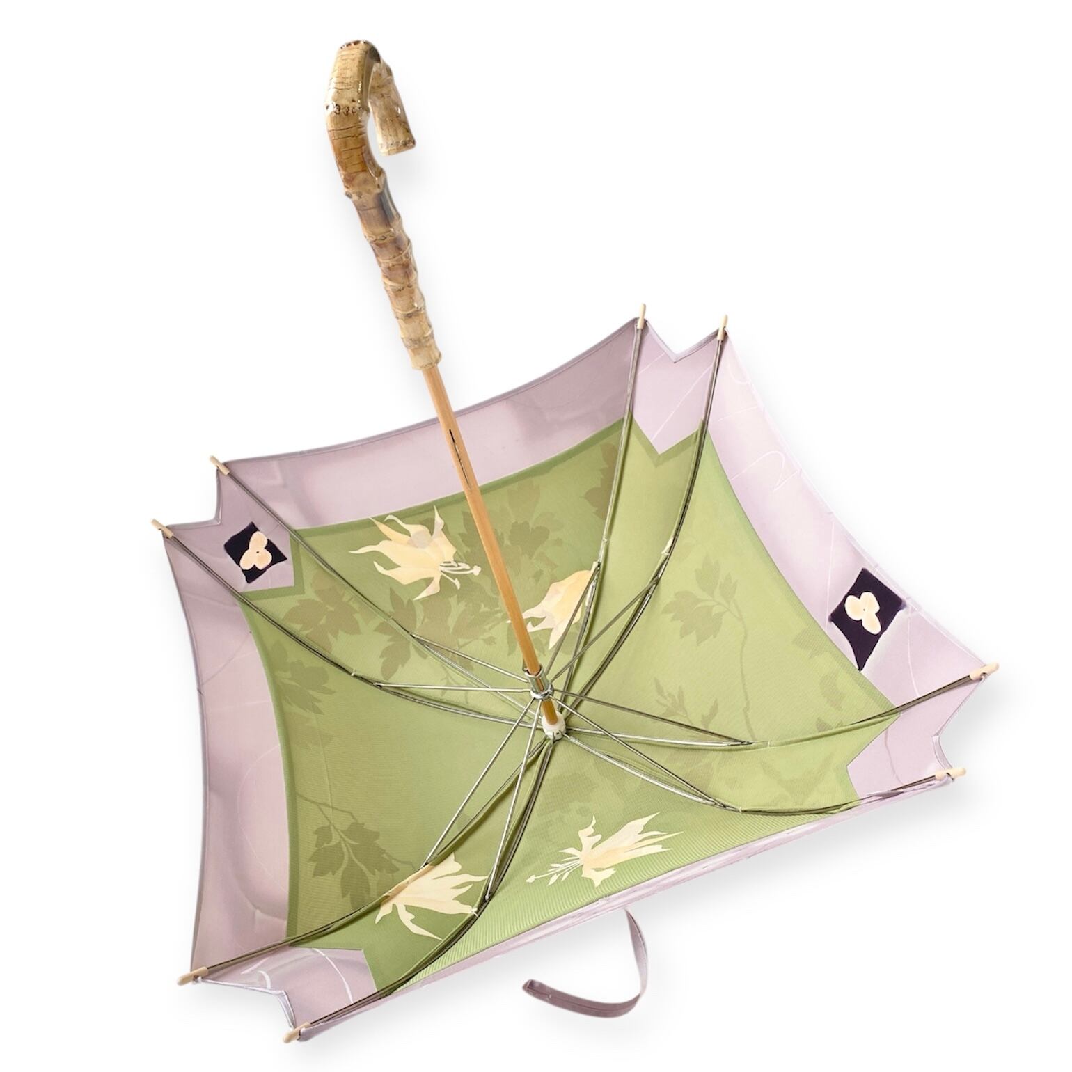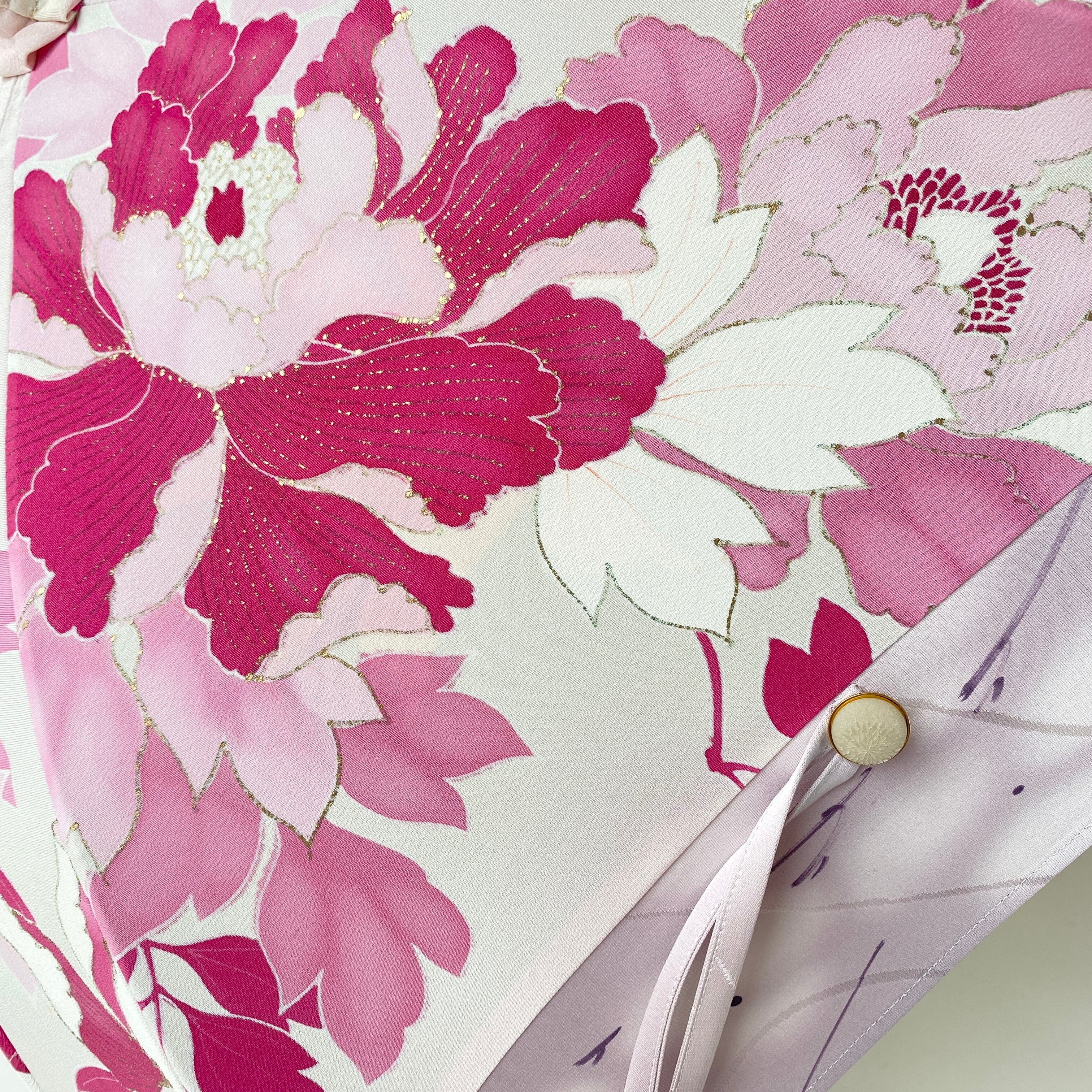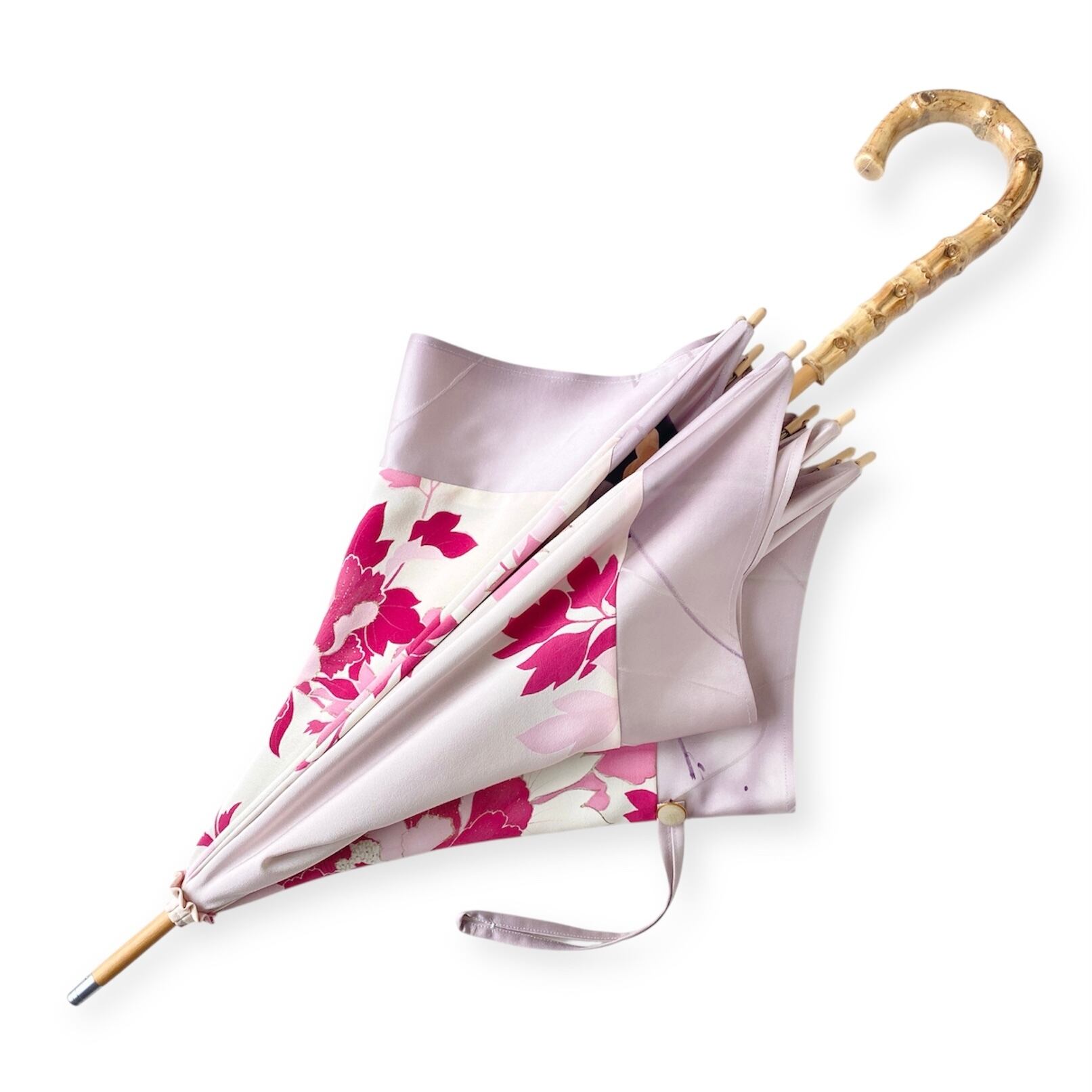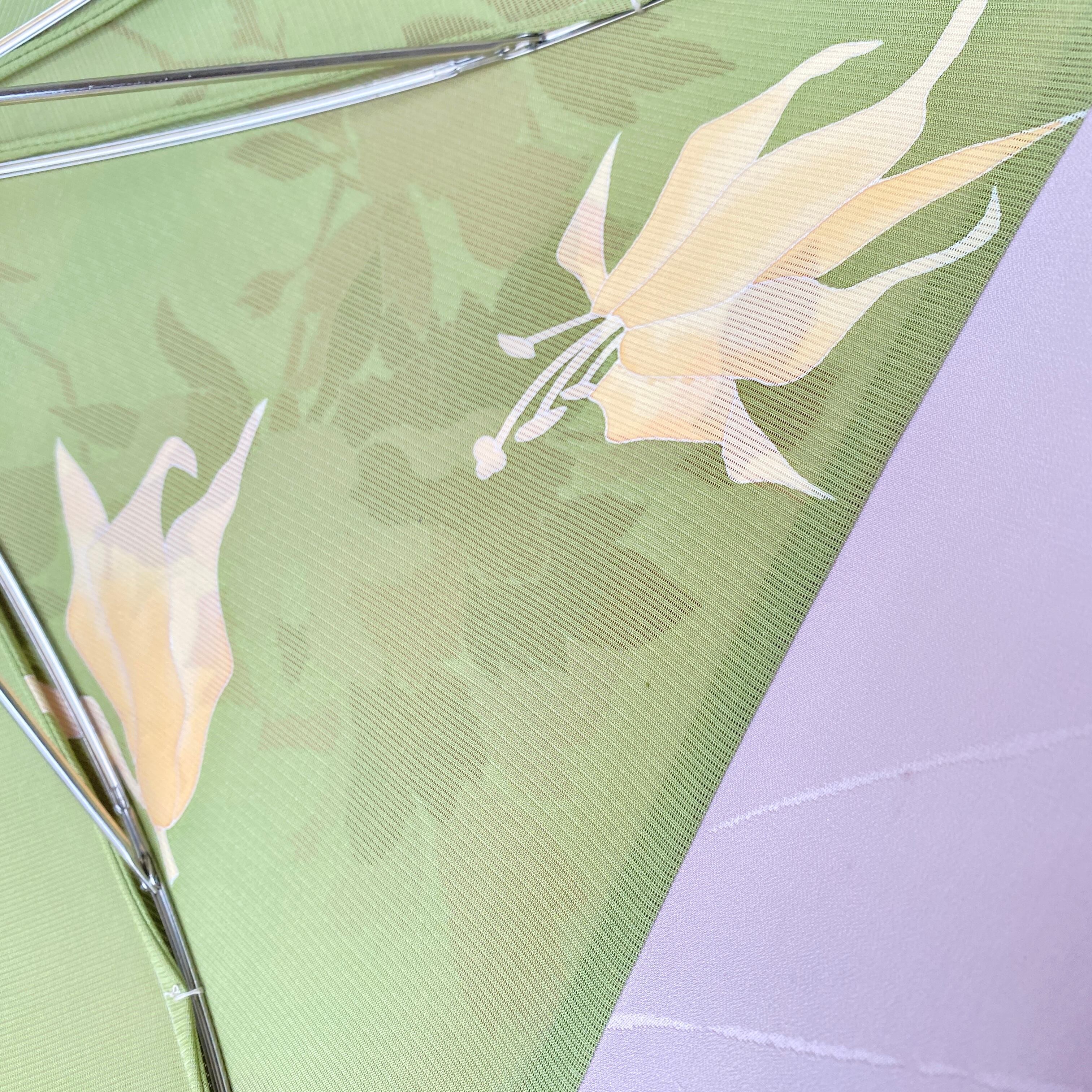 内側もかわいい着物地の日傘クロス型 四角 長傘 ピンク系金彩 内側は黄緑絽 only oneスクエア日傘