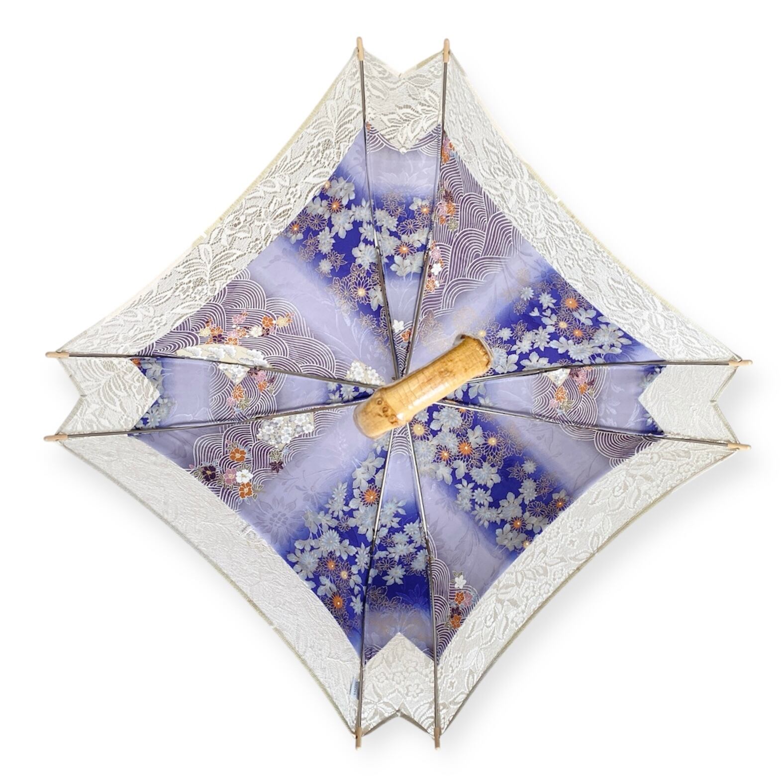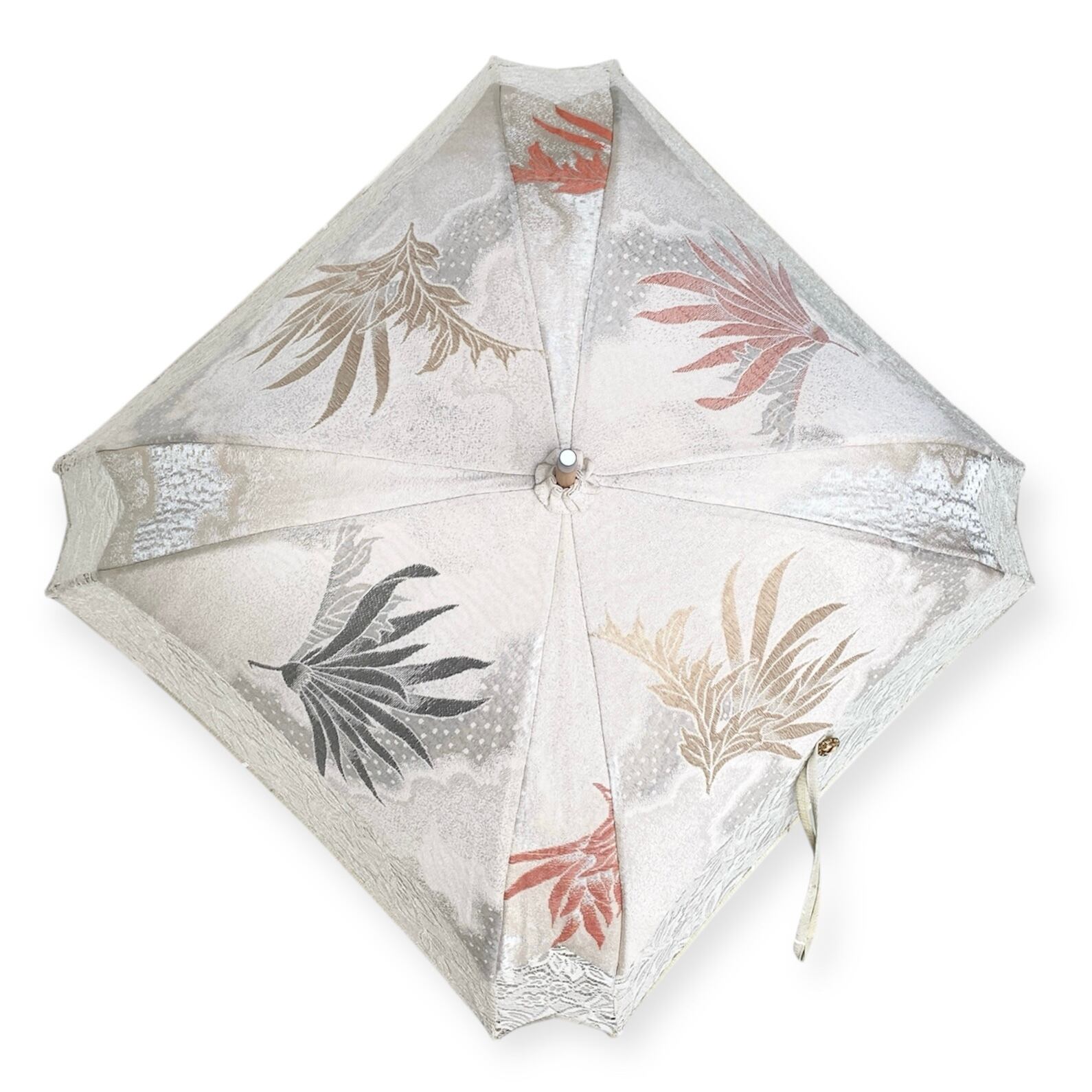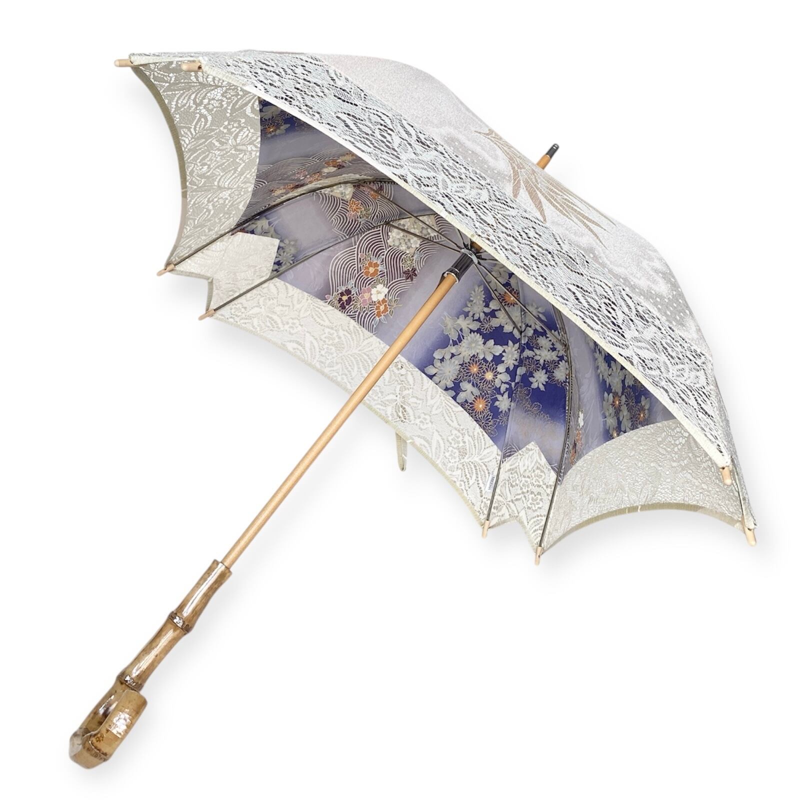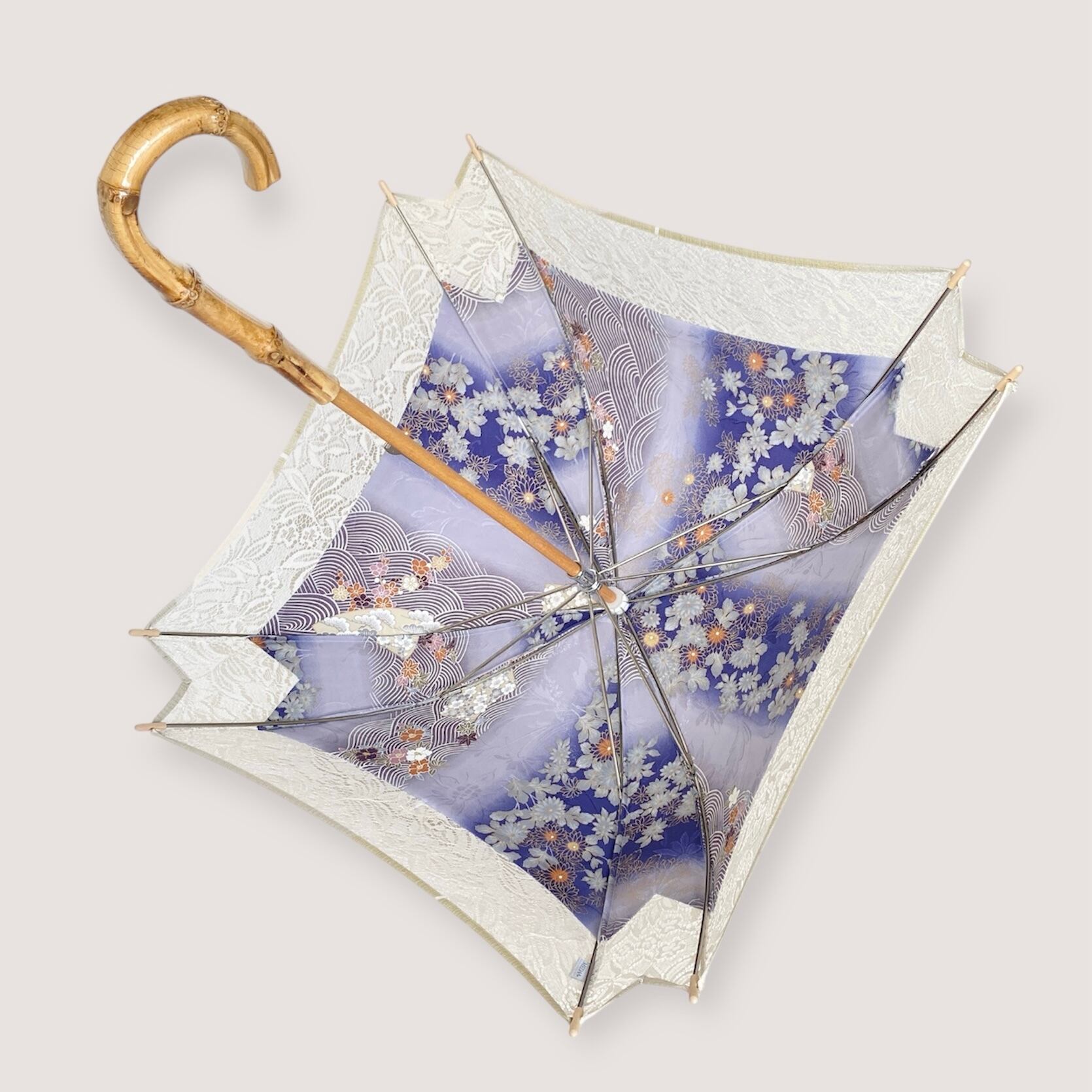 内側もかわいい着物地の日傘クロス型 四角 長傘 銀糸が織り込まれた淡いベージュ 内側は青紫系 only oneスクエア日傘