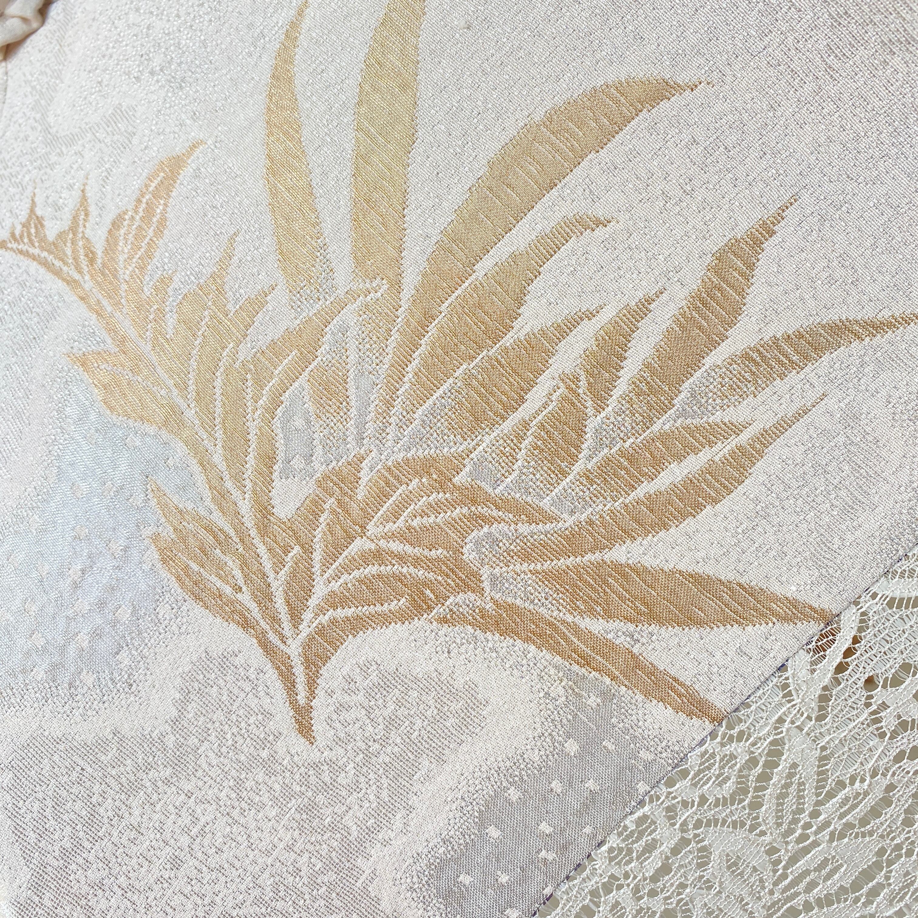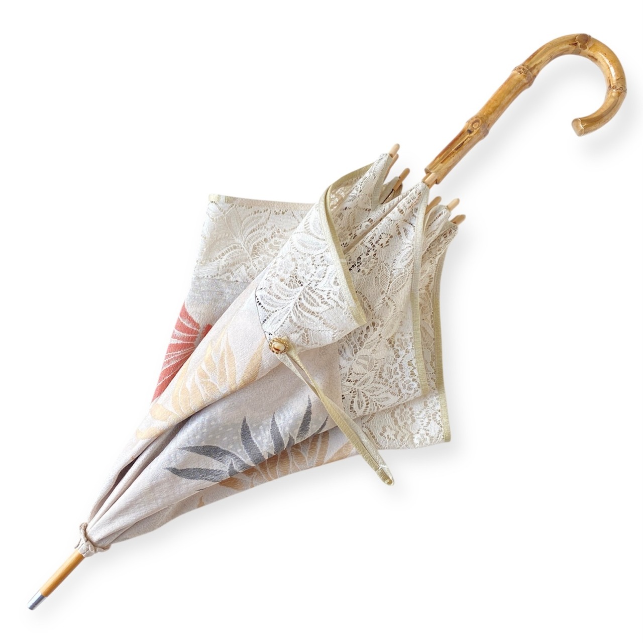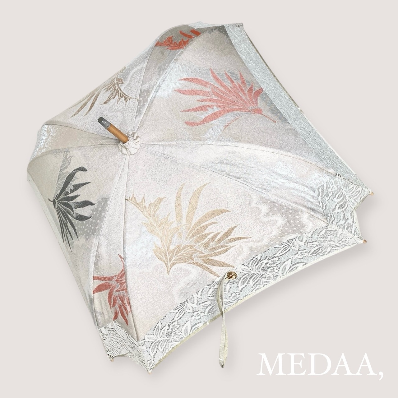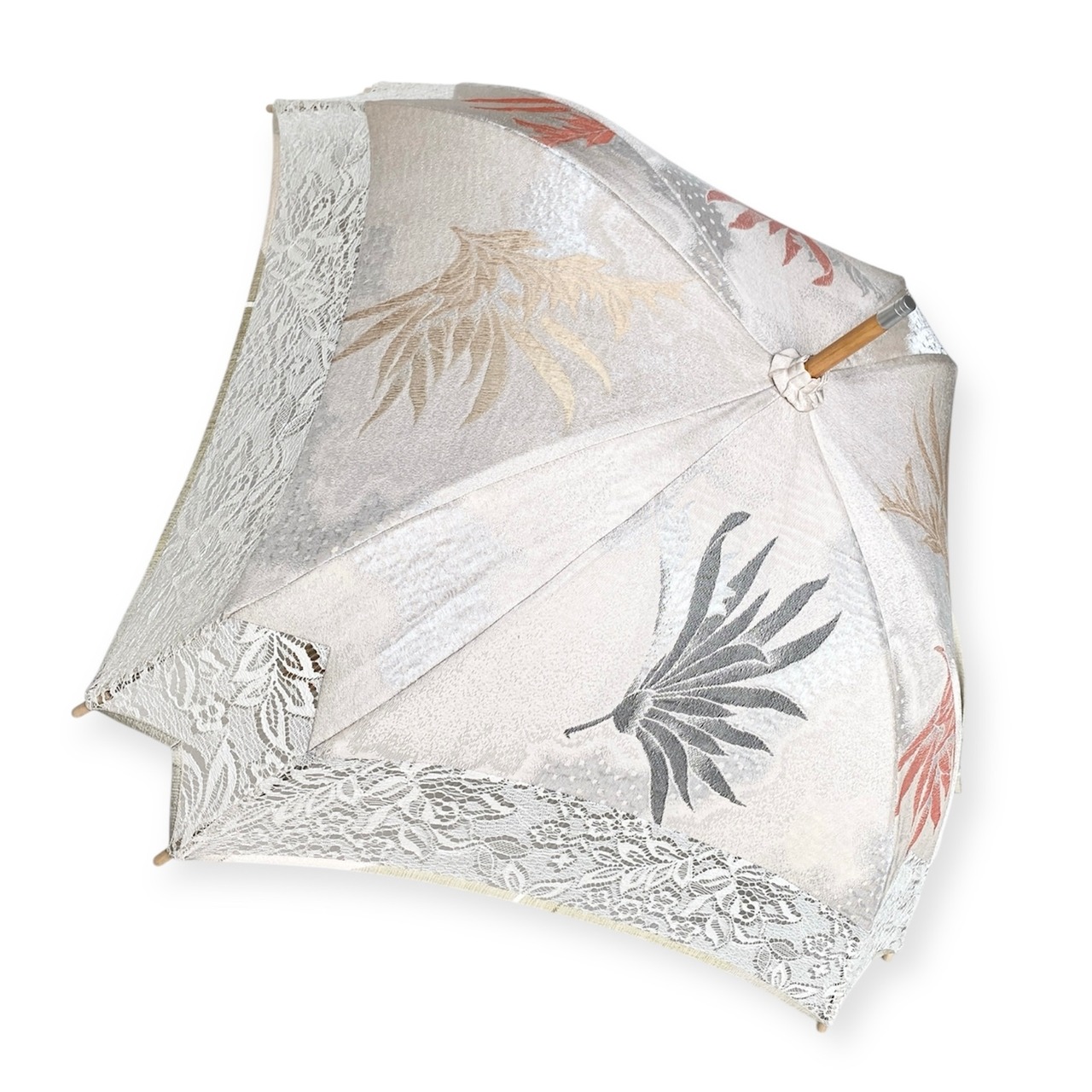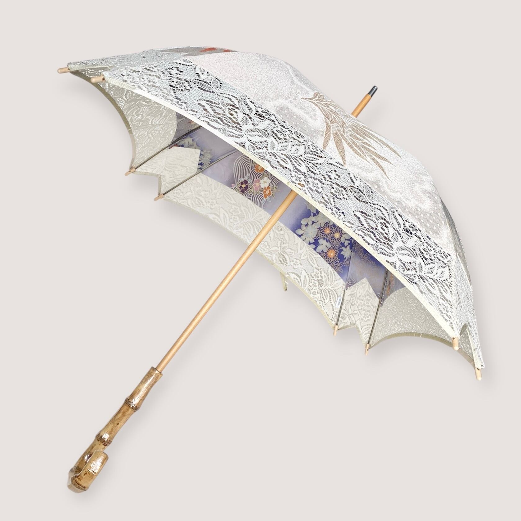 内側もかわいい着物地の日傘クロス型 四角 長傘 銀糸が織り込まれた淡いベージュ 内側は青紫系 only oneスクエア日傘