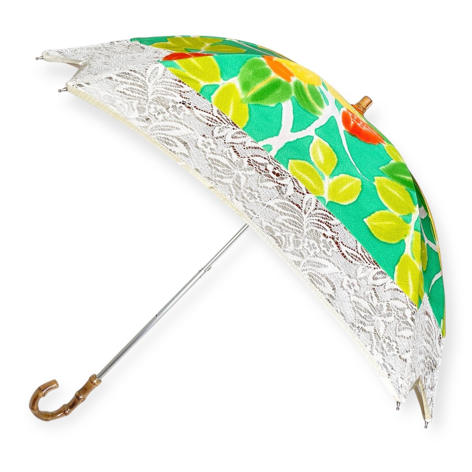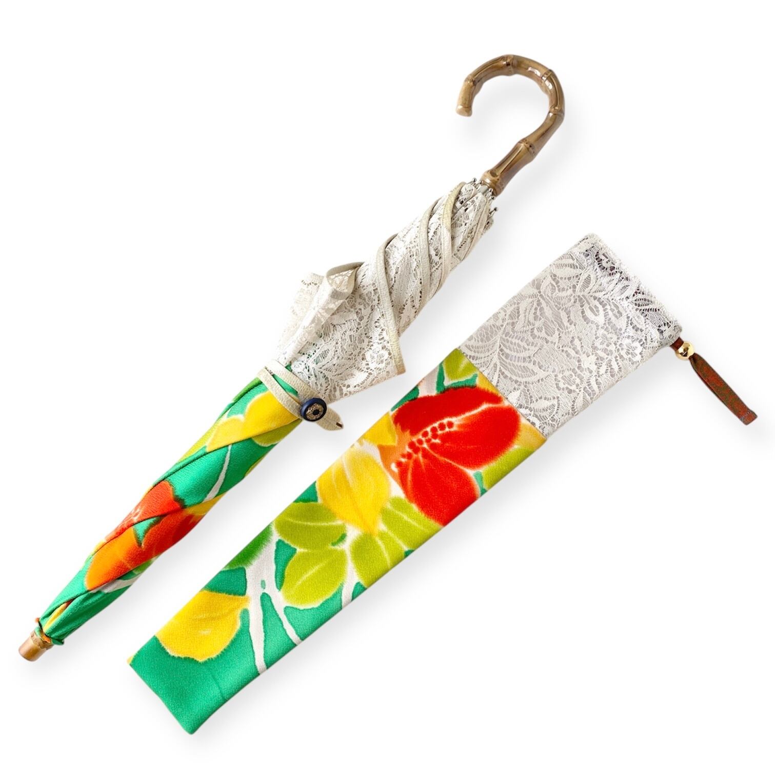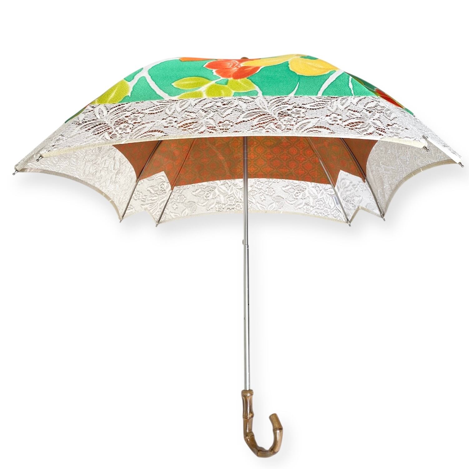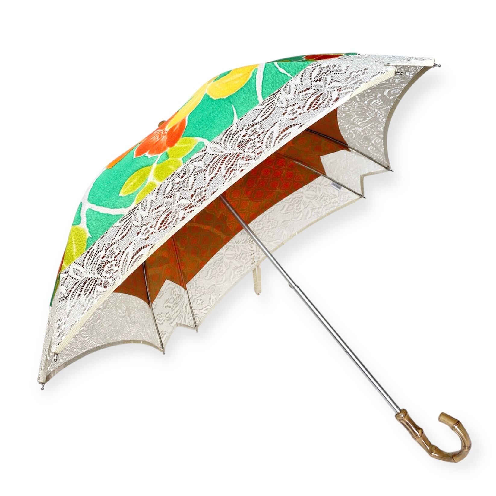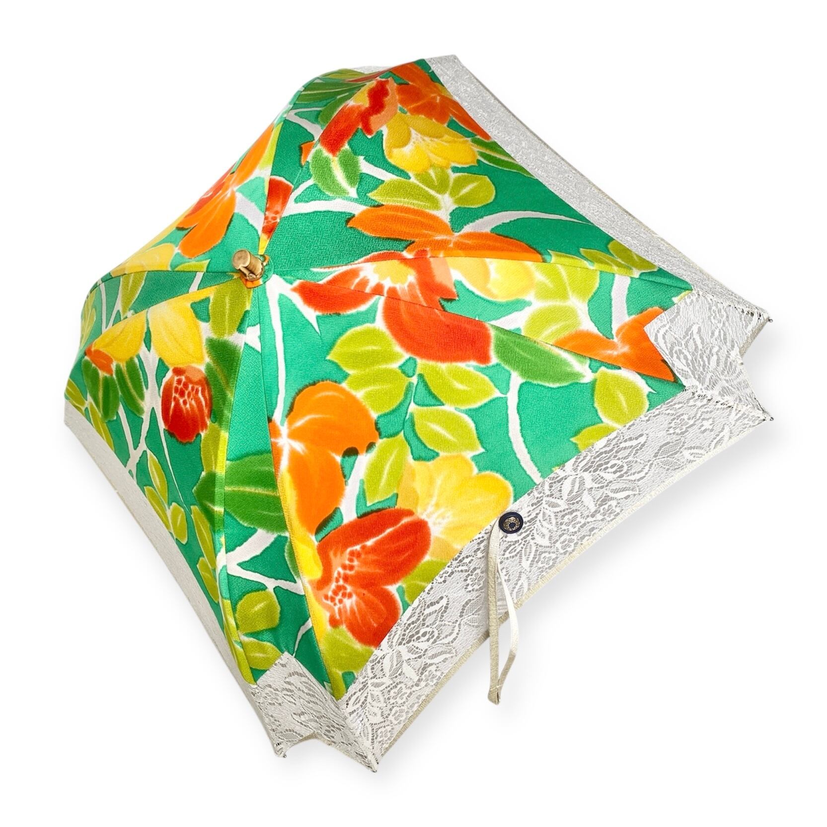 内側もかわいい着物地の日傘クロス型 【伸縮長傘】 鮮やかなグリーン×レース 内側はオレンジ only oneスクエア日傘 四角