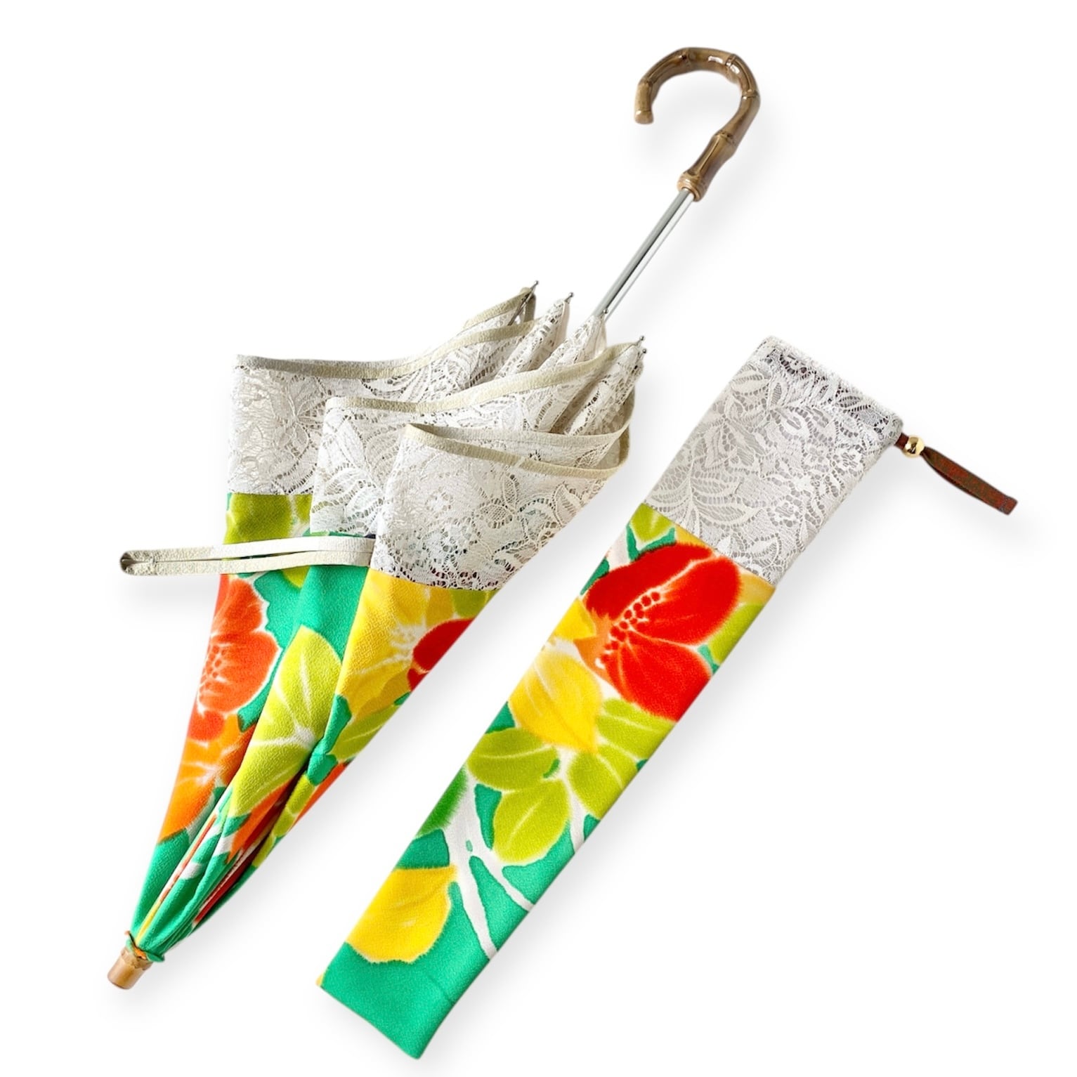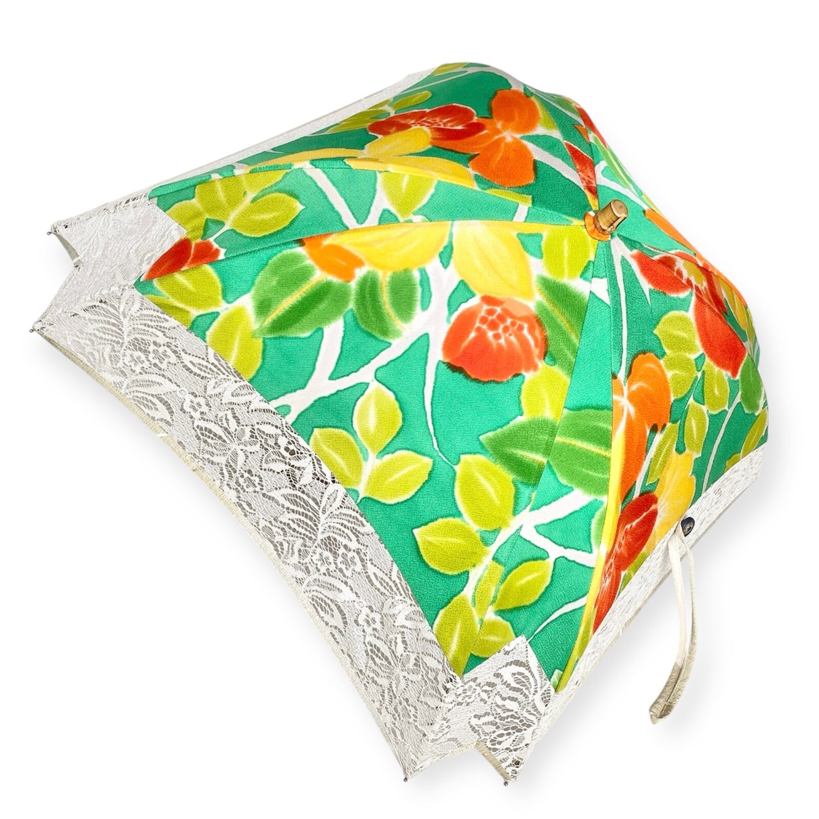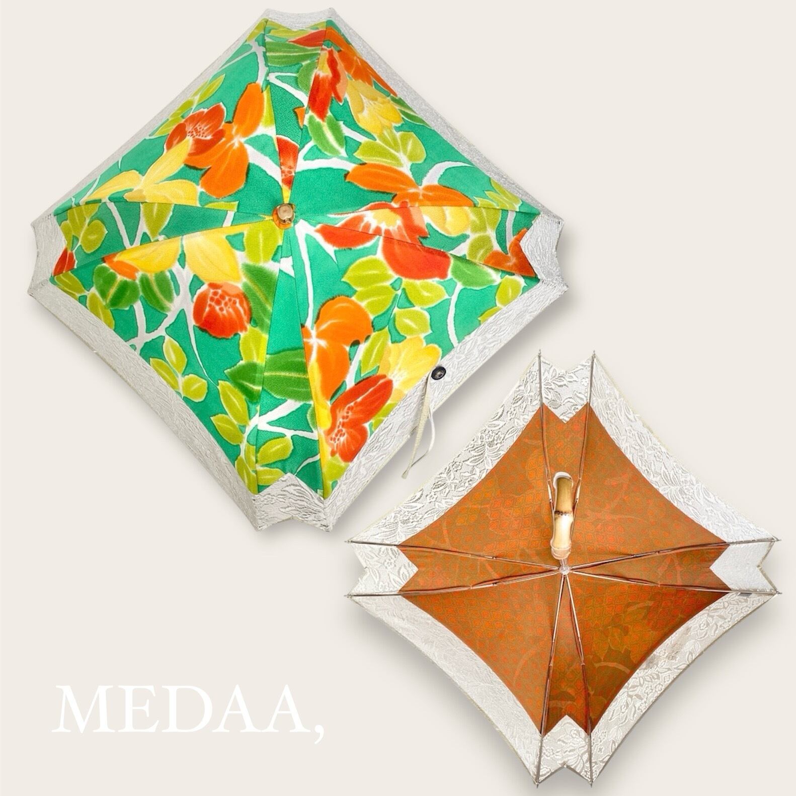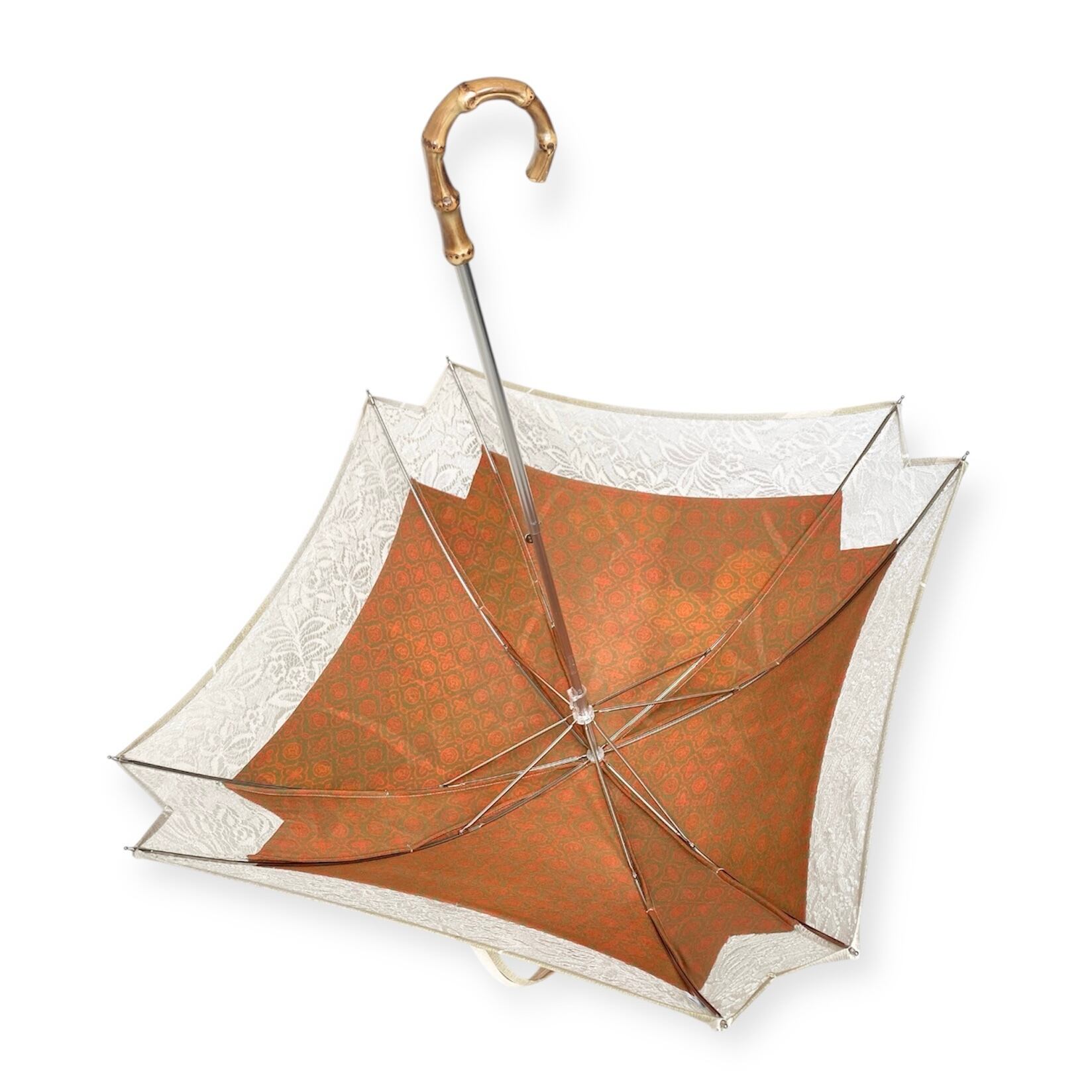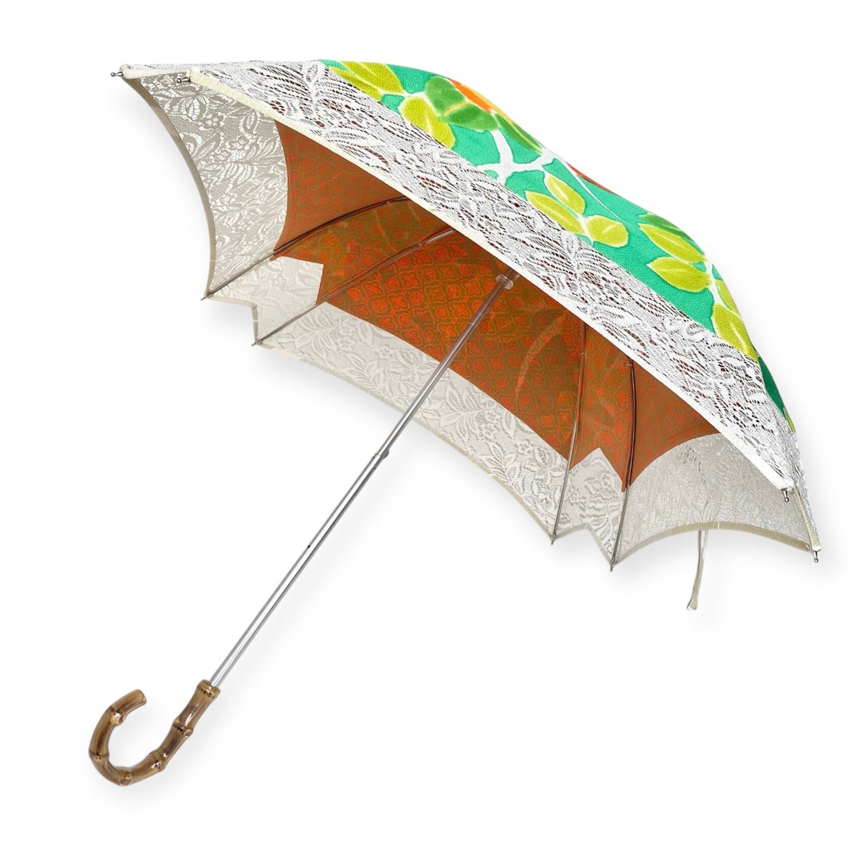 内側もかわいい着物地の日傘クロス型 【伸縮長傘】 鮮やかなグリーン×レース 内側はオレンジ only oneスクエア日傘 四角