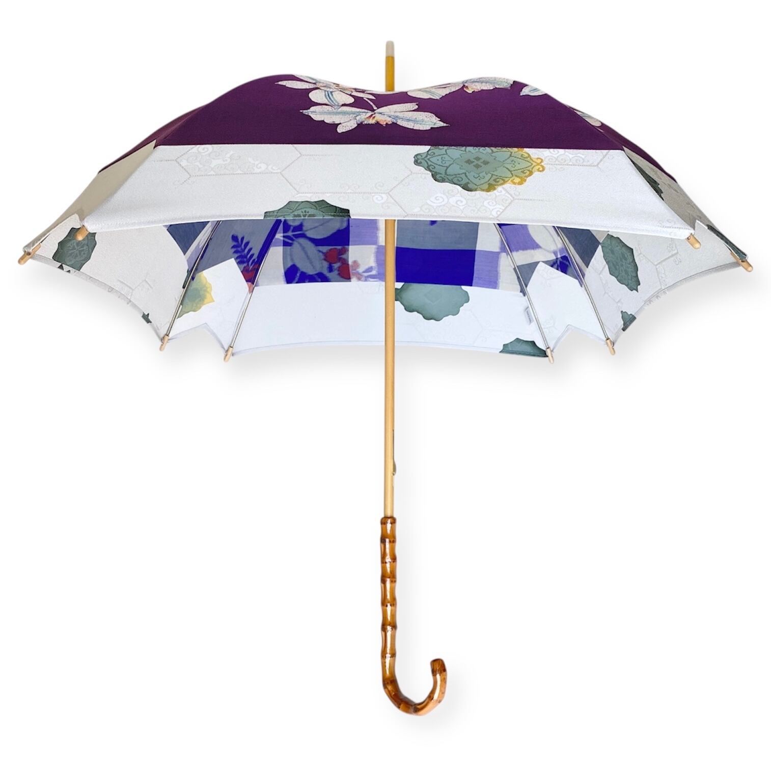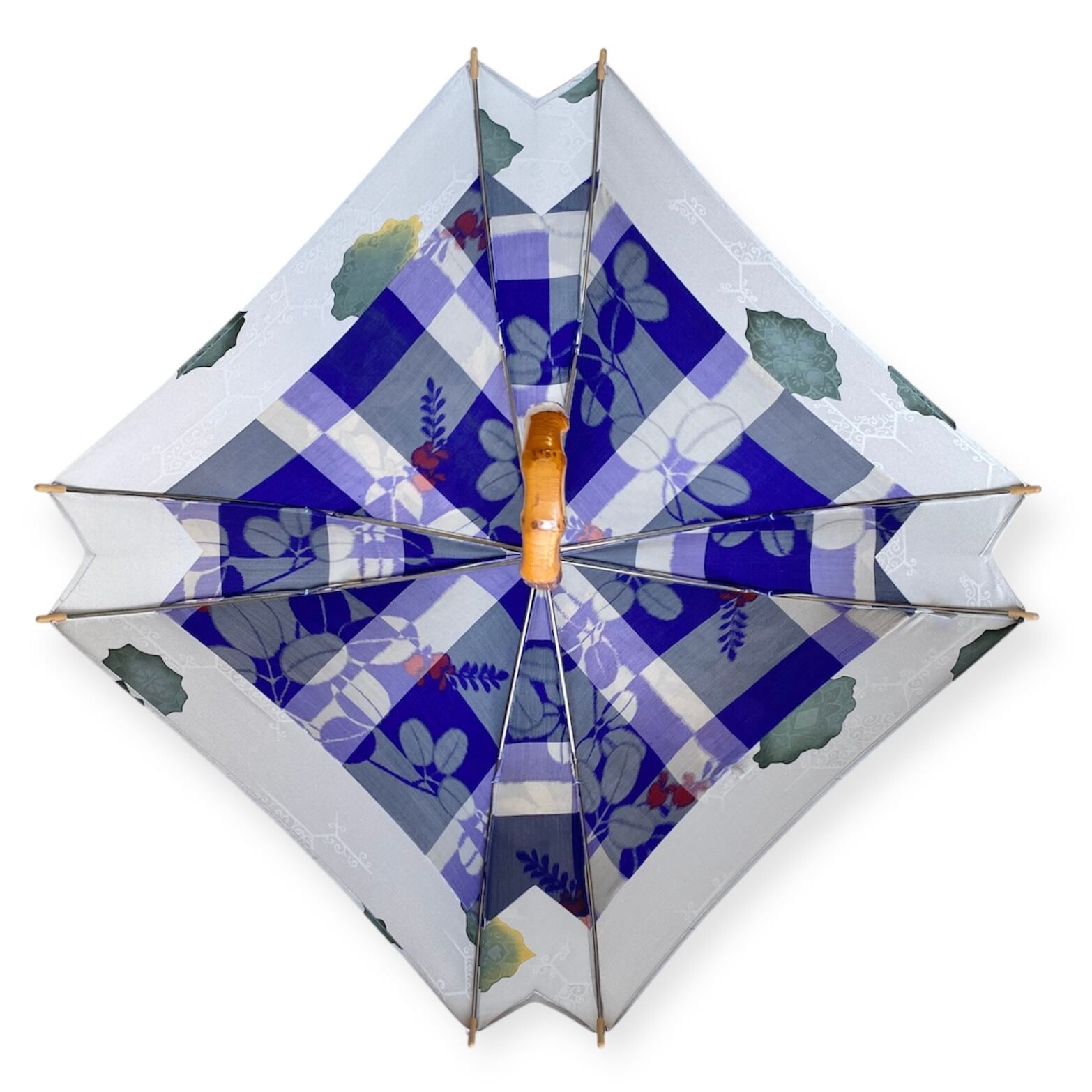 内側もかわいい着物地の日傘日傘クロス型 長傘 紫ろうけつ染め 内側はブルー系銘仙格子 only oneスクエア日傘