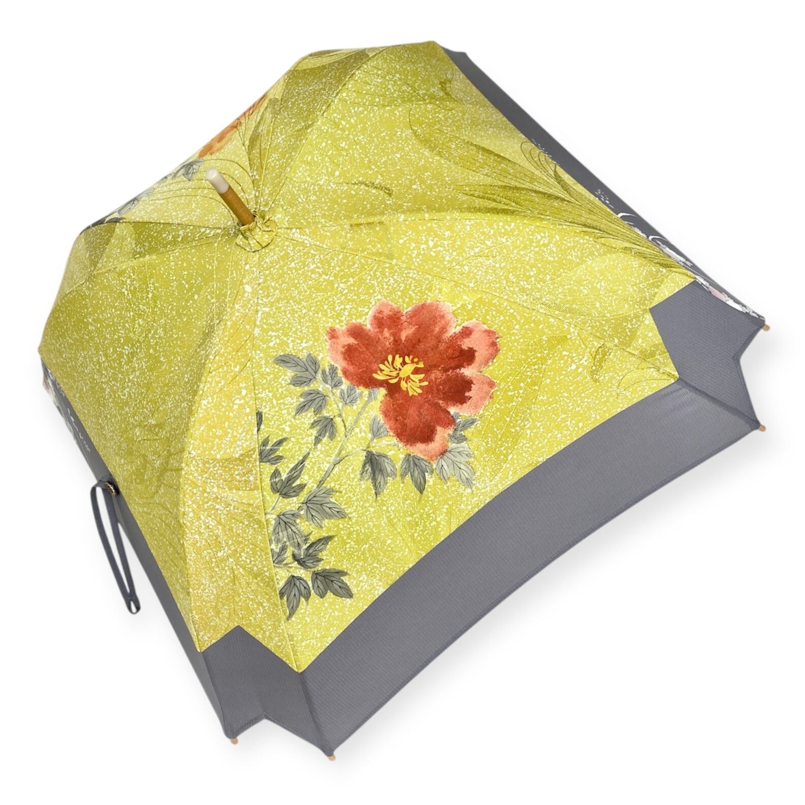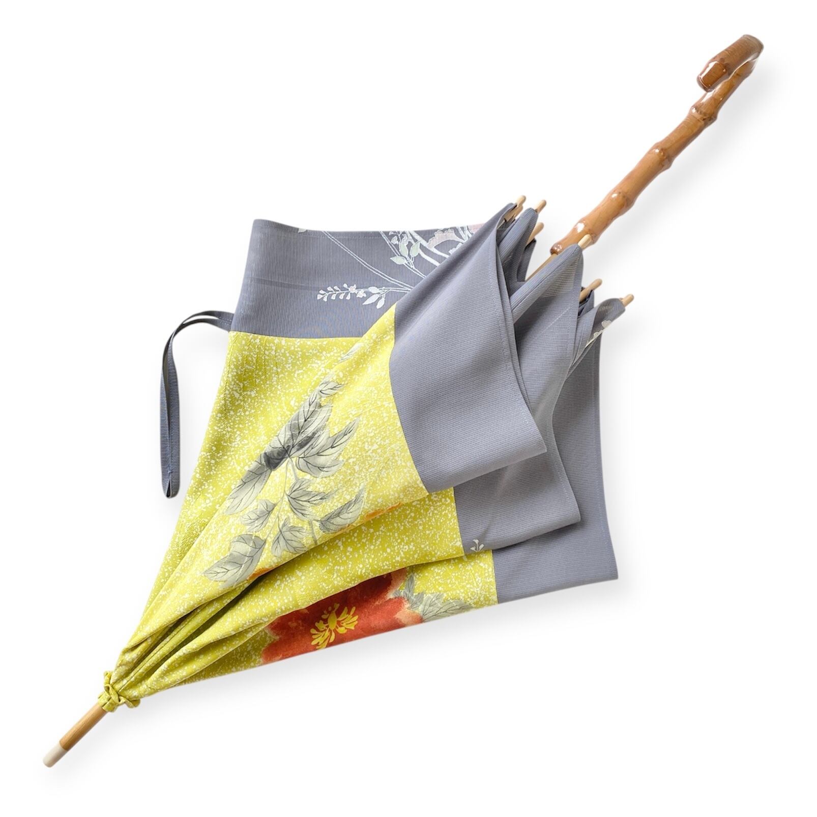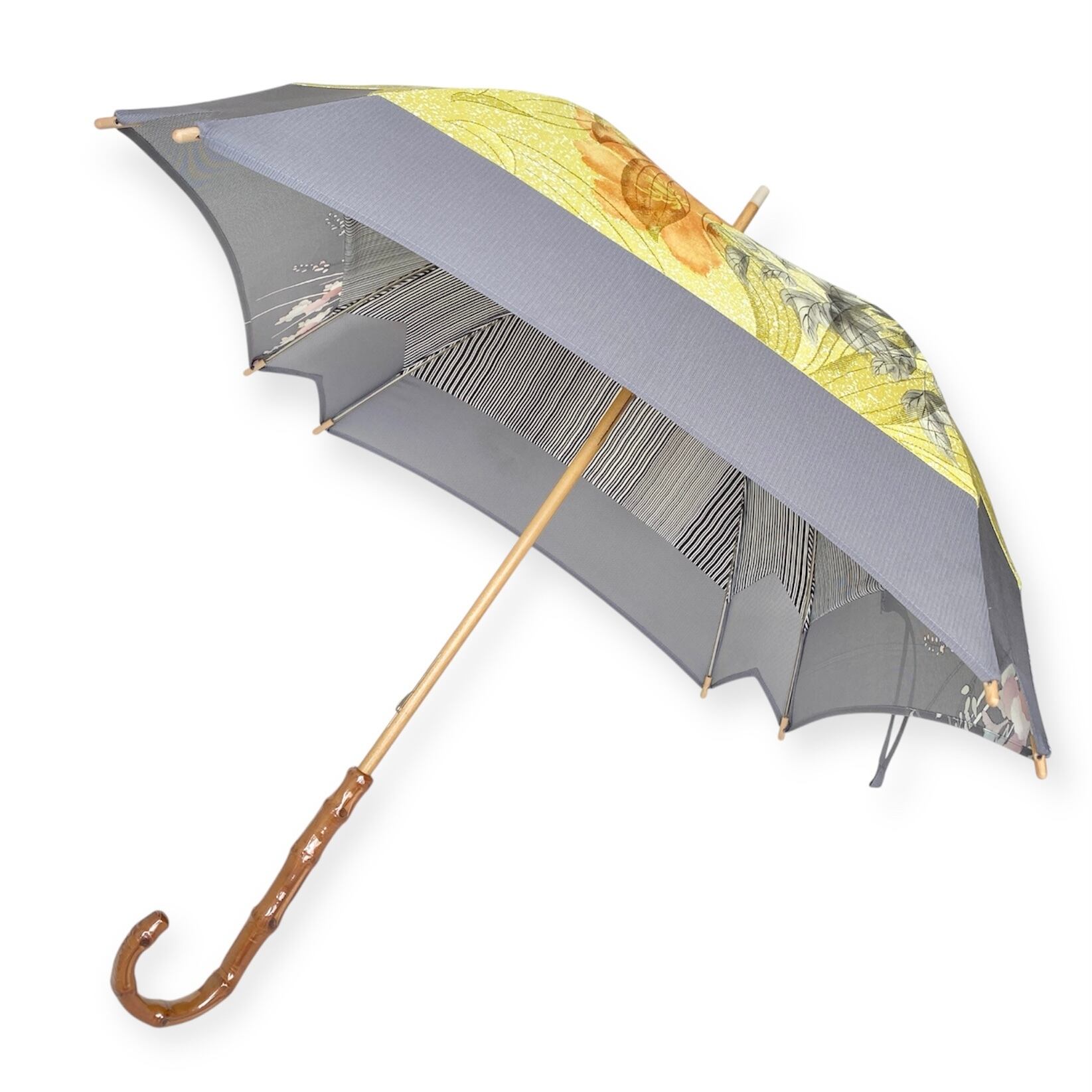 内側もかわいい着物地の日傘日傘クロス型 長傘 黄色たたき染×グレー絽 内側はモノトーン縞 only oneスクエア日傘
