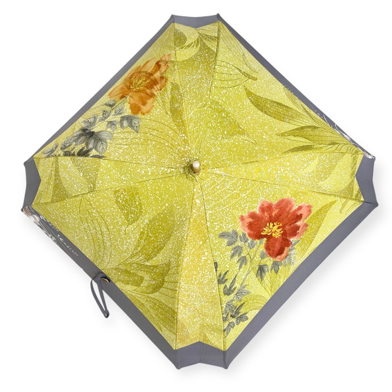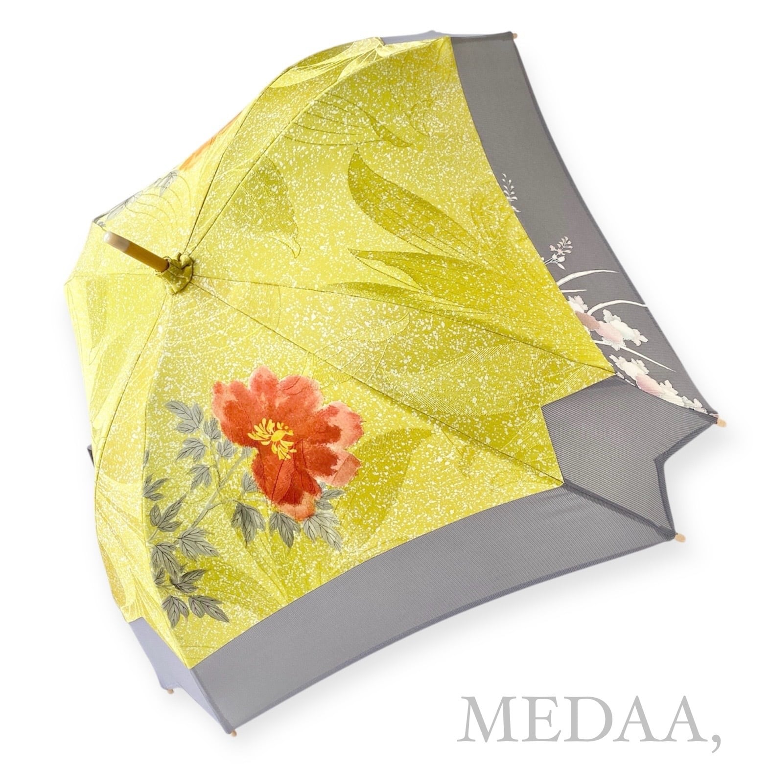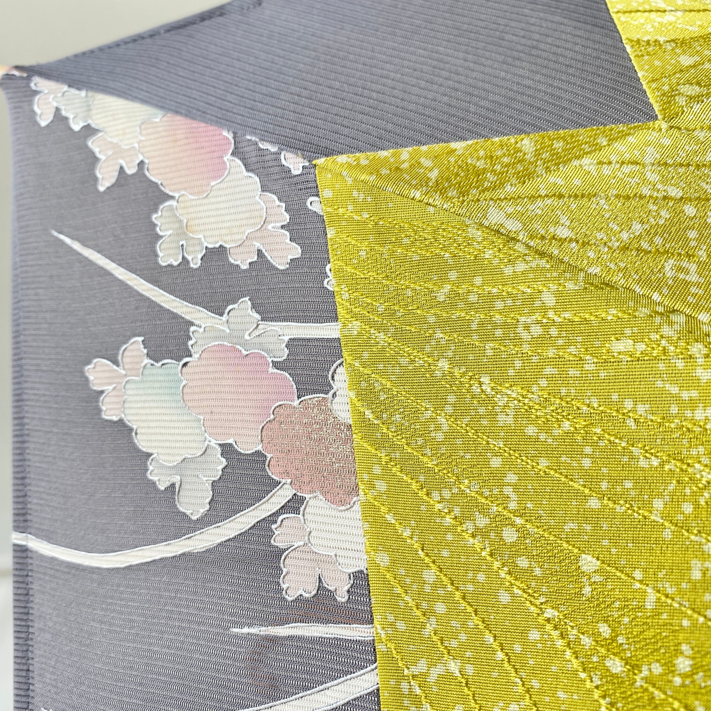 内側もかわいい着物地の日傘日傘クロス型 長傘 黄色たたき染×グレー絽 内側はモノトーン縞 only oneスクエア日傘
