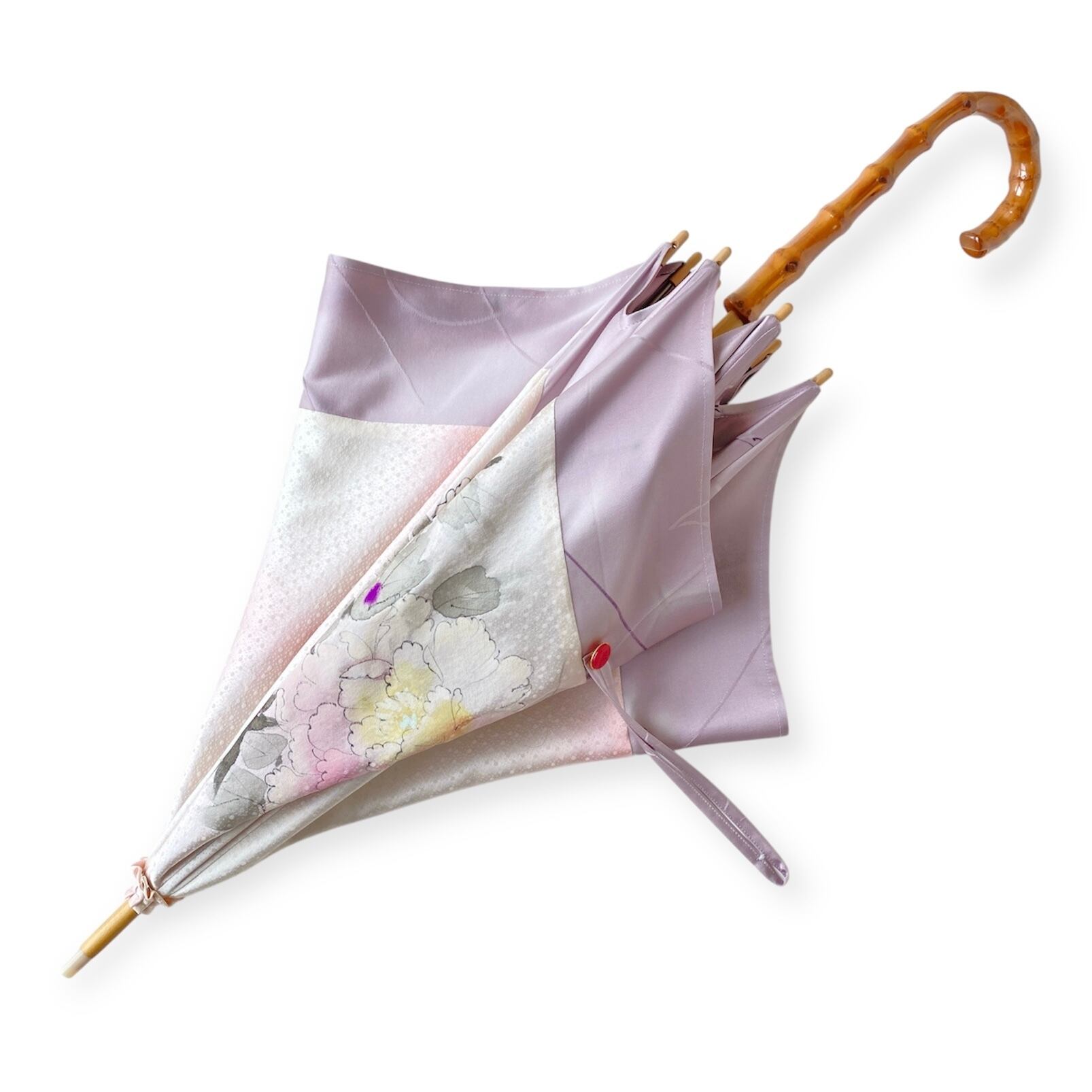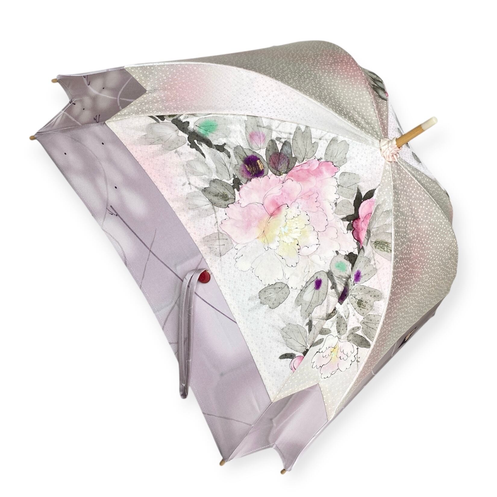 内側もかわいい着物地の日傘日傘クロス型 長傘 淡いピンク手描き牡丹 内側はパープル only oneスクエア日傘