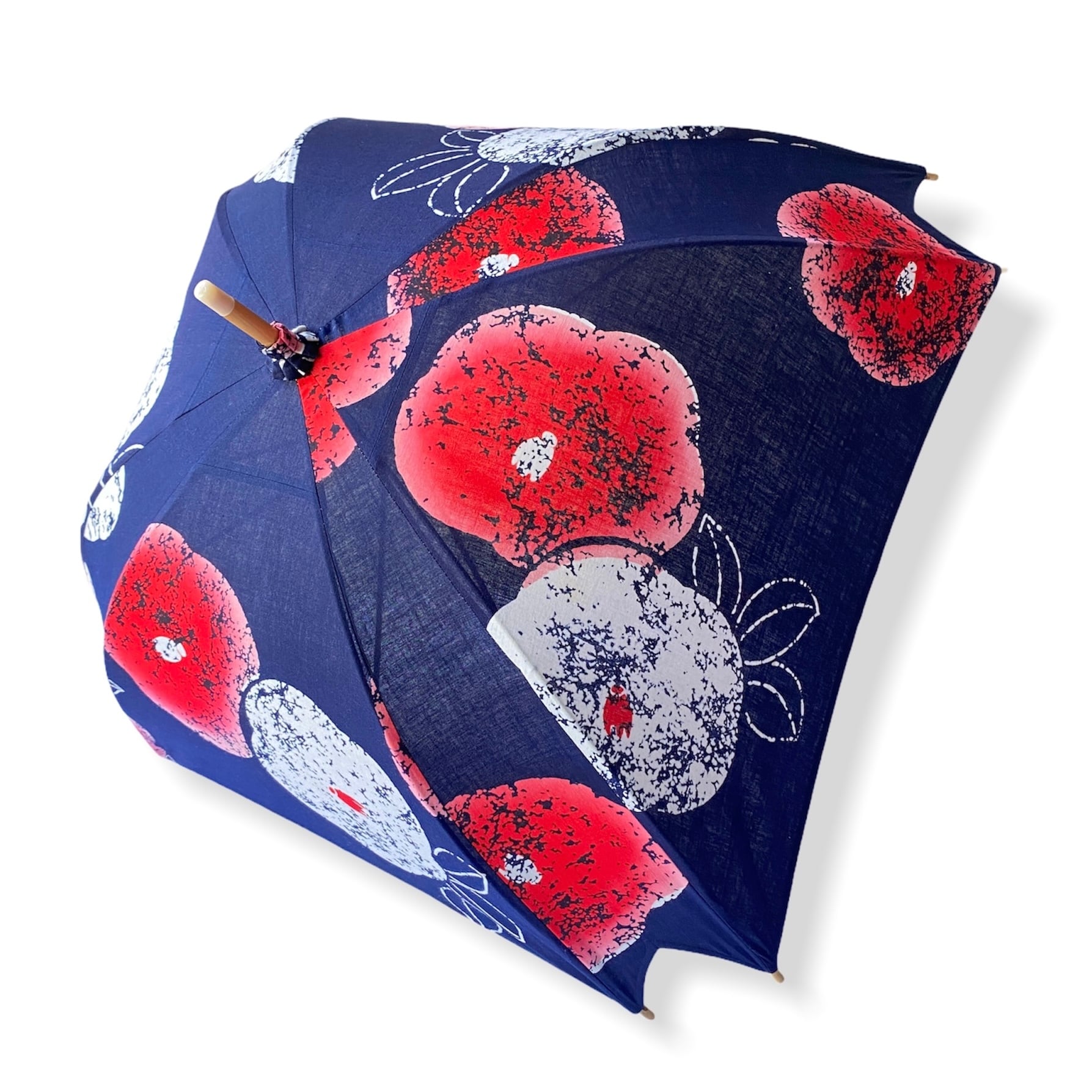 濃紺に赤と白の椿がかわいい浴衣の反物から作った日傘です。