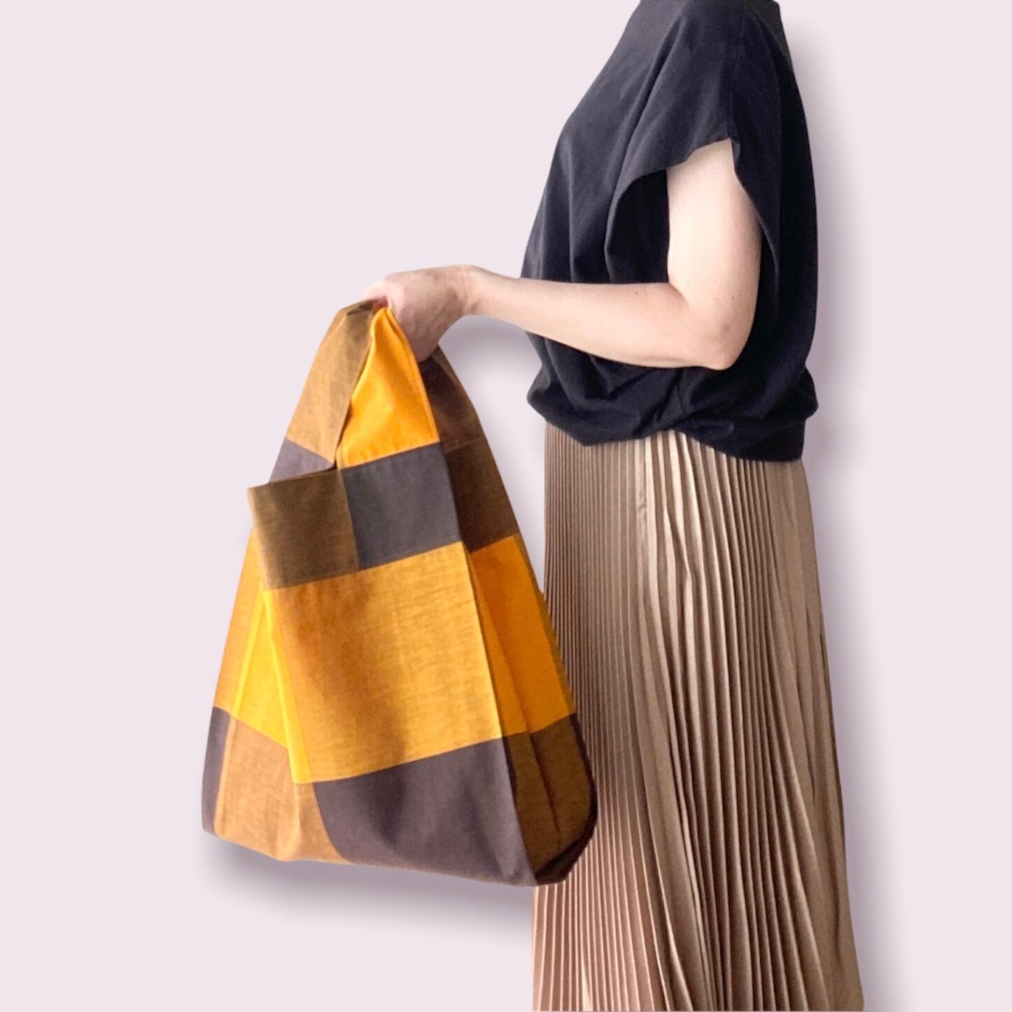 バッグの底が地面につかないように、持ち手は短めにしました。重い荷物も手にできるだけ負担をかけずに持てるように持ち手の幅は広めにしています。やわらかいのでクシャッと握ることもできます。