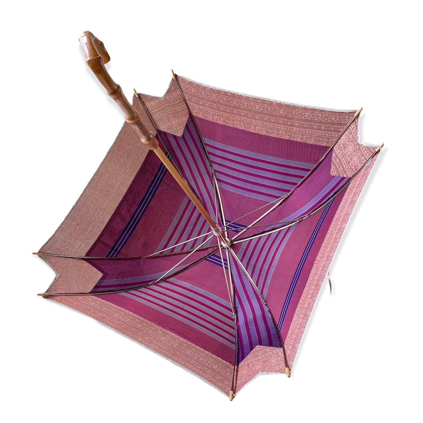 四角い日傘は3種類(ドーム型、平型、全平型)のパターンがあり、こちらはドーム型です。同じパターンでも生地によって少し丸みが変わります。