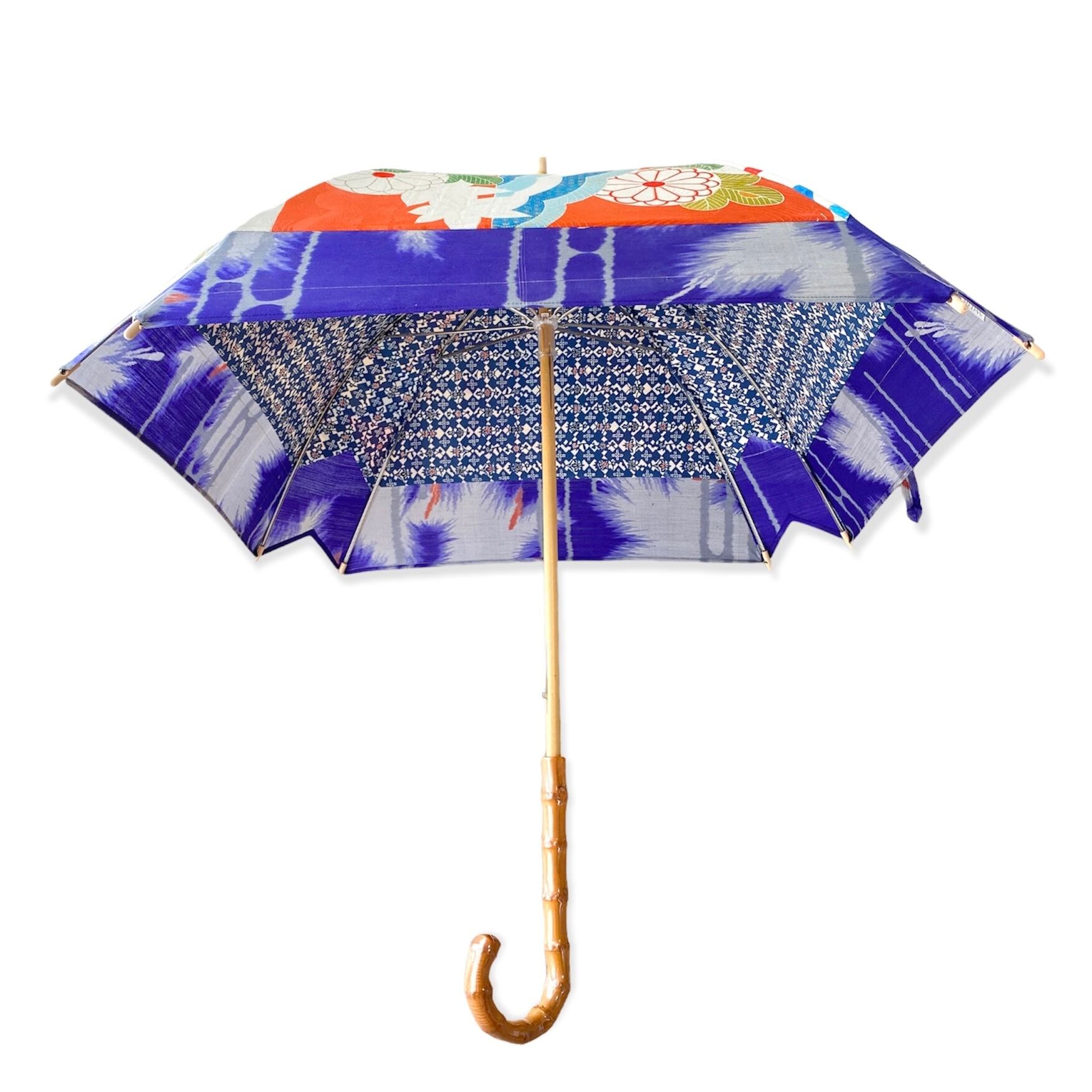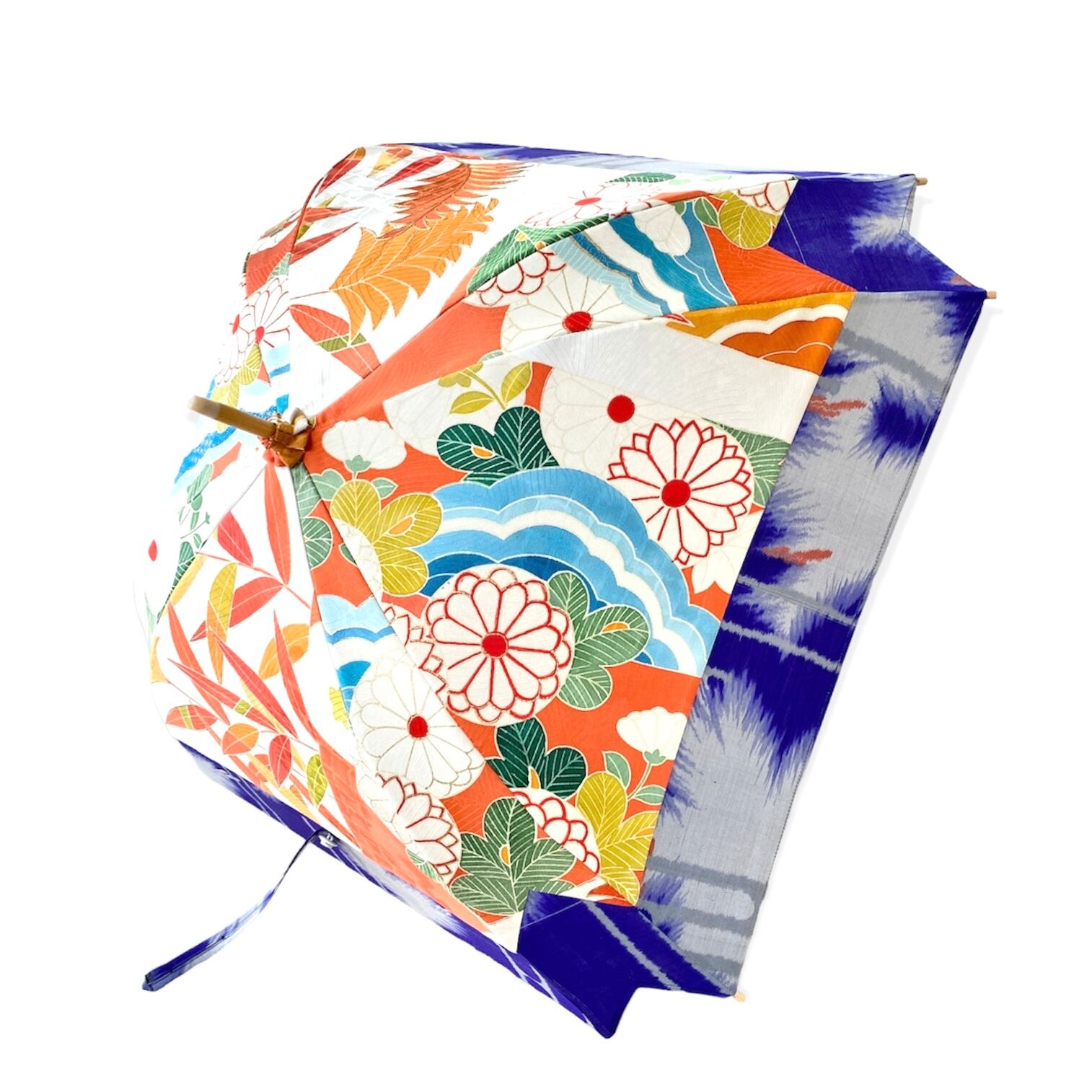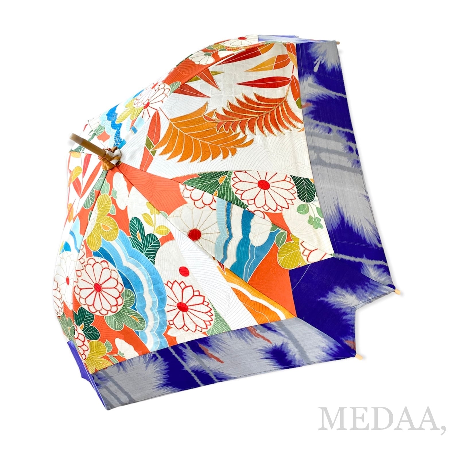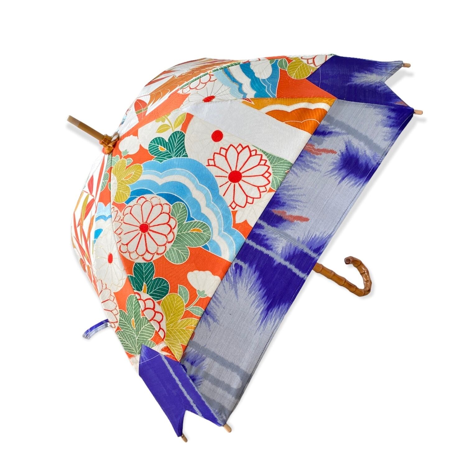 お洒落な裏地付き!着物地の日傘クロス型 長傘 振袖オフ白橙×青 内側ブルー系 only one