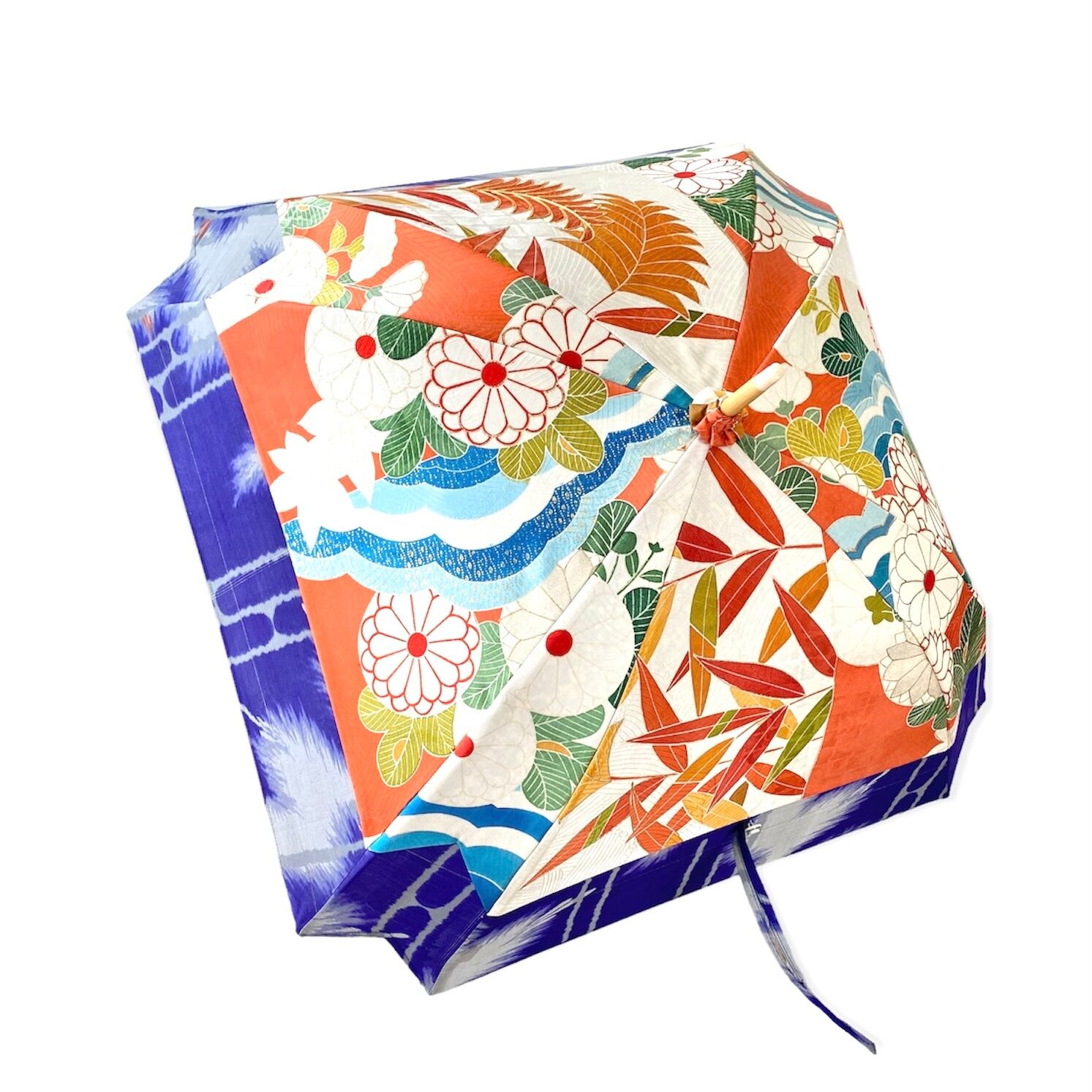 華やかな振袖の着物を使った一点モノのスクエア日傘です。縁には鮮やかなブルーの銘仙を合わせました。
