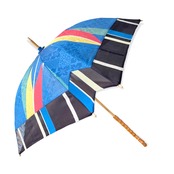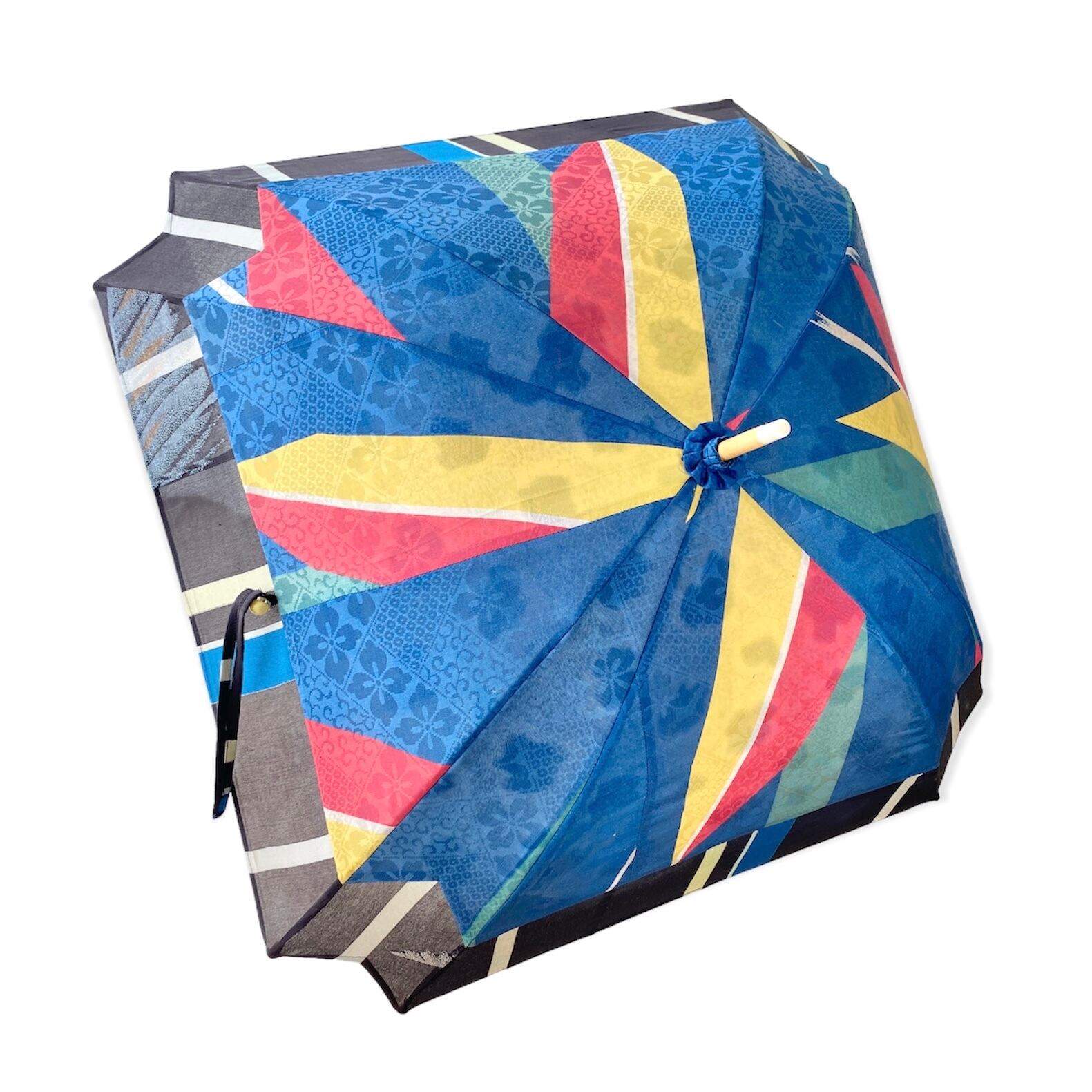 お洒落な裏地付き!着物地の日傘クロス型 長傘 ブルー矢羽×黒縞 内側白ヒョウ only one