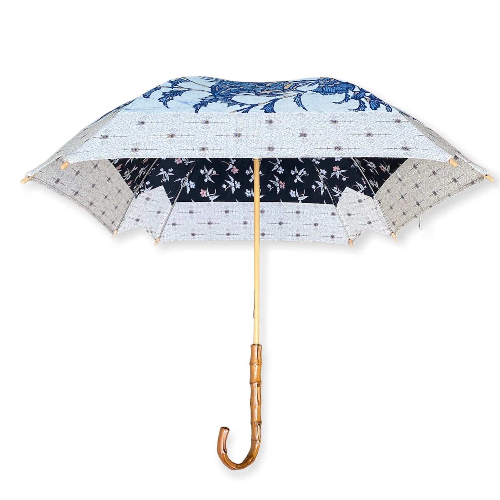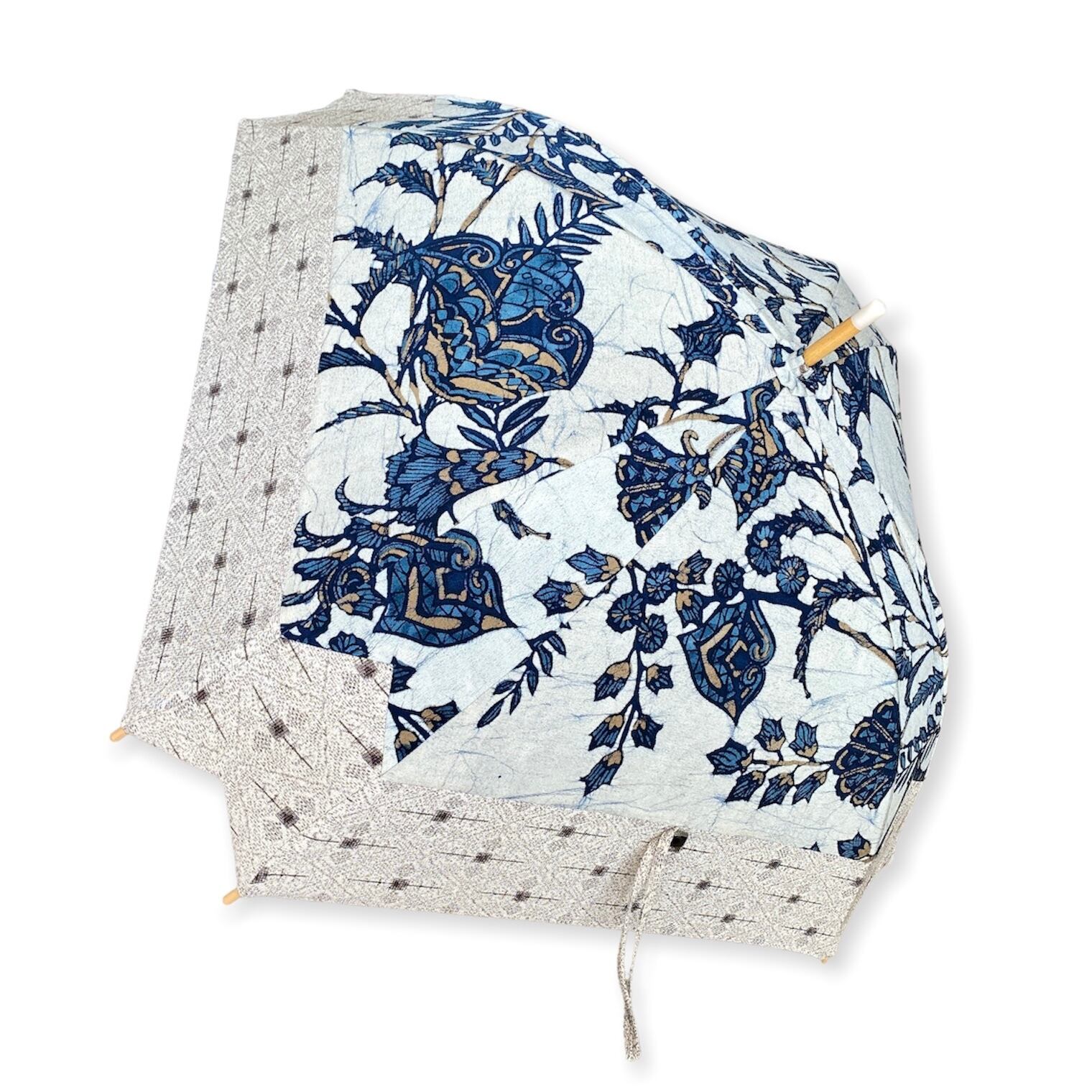 お洒落な裏地付き!着物地の日傘クロス型 長傘 白に近い水色に紺のろうけつ染め×薄いベージュ 内側は黒 only one