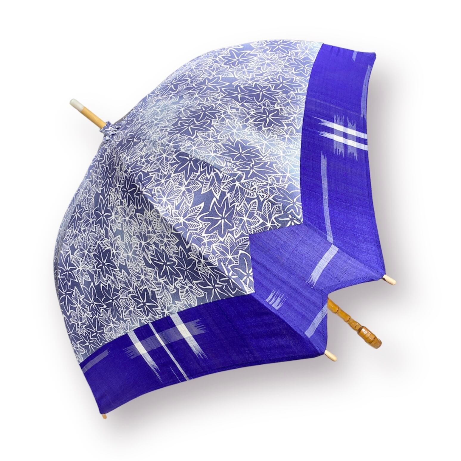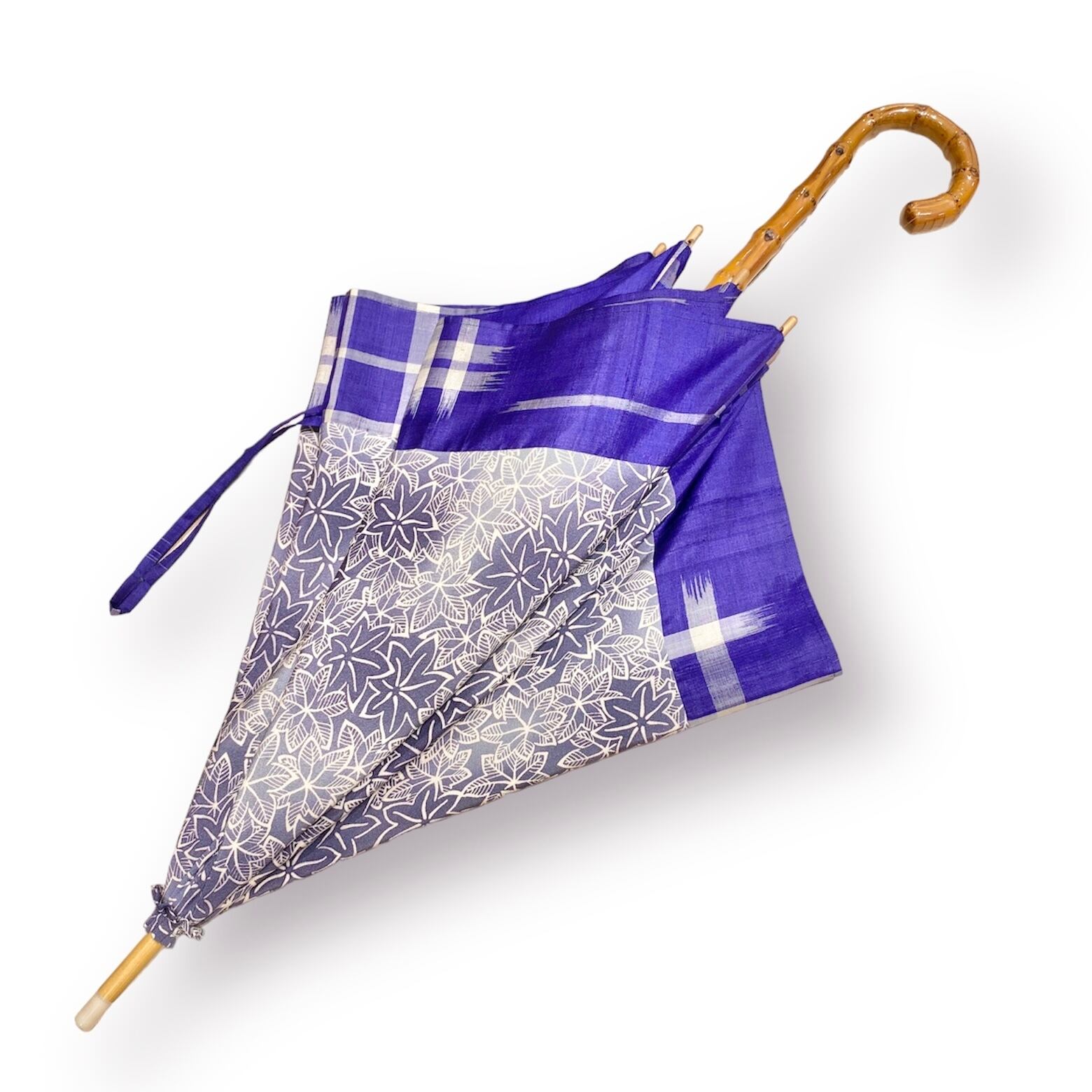 お洒落な裏地付き!着物地の日傘クロス型 青系楓×青紫かすり模様 内側は夕焼け空の様な暈し only one