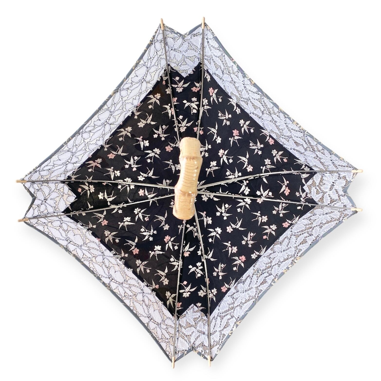 内側もかわいい着物地の日傘 クロス型 長傘 淡い黄緑×レース 内側黒 only oneスクエア日傘407